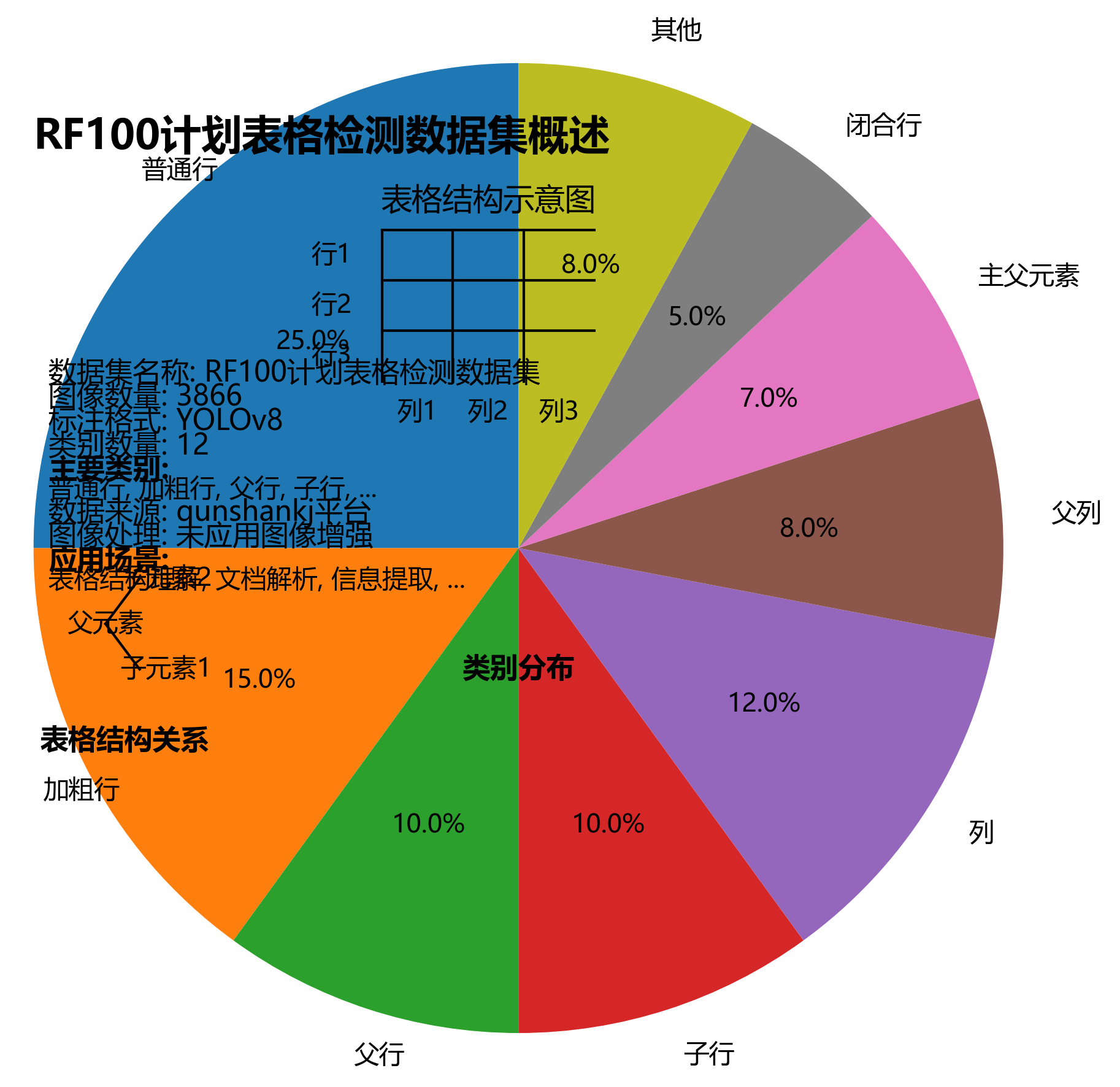 该数据集是RF100计划的一部分,由Intel赞助,旨在创建用于模型泛化能力评估的新型目标检测基准。数据集以表格结构识别为核心,包含3866张图像,所有图像均以YOLOv8格式进行了详细标注。数据集涵盖12种类别,包括普通行、加粗行、父行、子行、列、父列、主父元素、闭合行等表格结构元素。这些标注能够精确识别表格中的各种结构关系,如直接父子关系、非直接父子关系等。数据集通过qunshankj平台导出,未应用任何图像增强技术,保持了原始数据的完整性。该数据集为表格结构理解、文档解析和信息提取等计算机视觉任务提供了高质量的训练和评估资源,适用于开发能够自动解析表格结构的智能系统,尤其在处理扫描文档、PDF转换表格等场景具有重要应用价值。