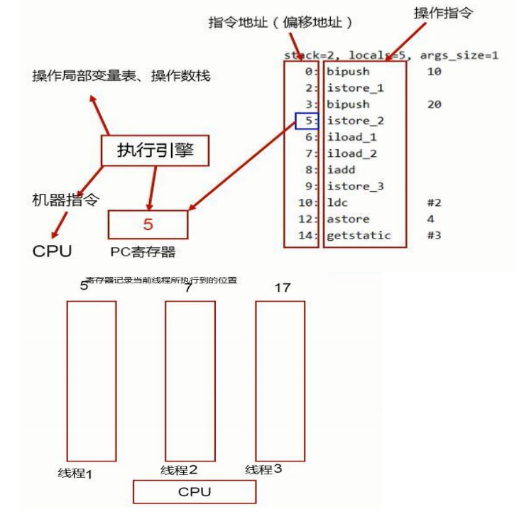 程序计数器是记录线程执行的指令集的位置,因为线程在执行时,CPU要进行切换执行,所以要记录线程执行的位置。 java是高级语言,每一条高级语言要分解成好几条指令执行
