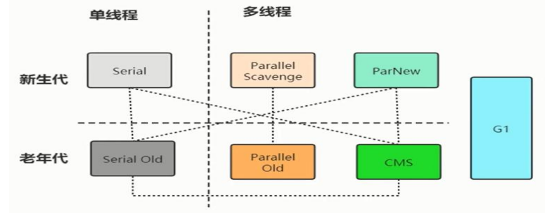 Serial,Serial Old,ParNew,Parallel Scavenge,Parallel Old,CMS,G1