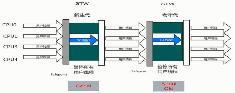 -XX:+UseSerialGC 年轻代使用 Serial GC, 老年代使用 Serial Old GC