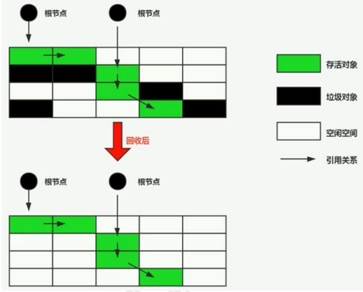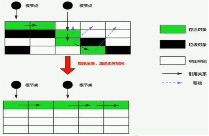 将存活对象压到内存的一端,重新排列,将边界外的空间清理,释放内存碎片,效果就像进行了一次标记-清除算法之后,进行了一次内存碎片整理。