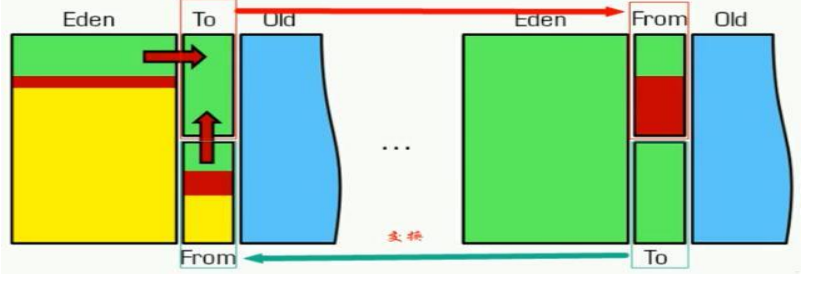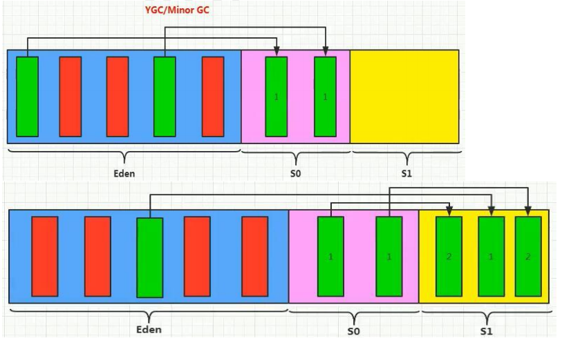 3.当下一次垃圾回收来临时,伊甸园区和幸存者0区没有被回收的对象进入幸存者1区,伊甸园区和幸存者0区被清空