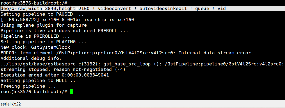 695.568722\] xc7160 6-001b: isp chip is xc7160 Using mplane plugin for capture Pipeline is live and does not need PREROLL ... Pipeline is PREROLLED ... Setting pipeline to PLAYING ... New clock: GstSystemClock ERROR: from element /GstPipeline:pipeline0/GstV4l2Src:v4l2src0: Internal data stream error. Additional debug info: ../libs/gst/base/gstbasesrc.c(3132): gst_base_src_loop (): /GstPipeline:pipeline0/GstV4l2Src:v4l2src0: streaming stopped, reason not-negotiated (-4) Execution ended after 0:00:00.003349041 Setting pipeline to NULL ... Freeing pipeline ... root@rk3576-buildroot:/# 进度已经同步到群里了。 rk3576-v1.0.1g-to-v1.0.1h.7z 我司 XX 昨天问我: 1、为什么 补丁:rk3576-v1.0.1g-to-v1.0.1h.7z 打了之后 打不开摄像头? 2、补丁:rk3576-v1.0.1g-to-v1.0.1h.7z【所实现的功能。】 使用你们百度网盘的 SDK,不打 第三个patch,已经可以4K录像了。 25\*60=1500 gst-launch-1.0 v4l2src device=/dev/video11 num-buffers=1500 ! video/x-raw,format=NV12, width=3840,height=2160 ! tee name=t ! queue ! mpph264enc ! queue ! h264parse ! qtmux ! filesink location=8ms1_h264_4k_1500.mp4 t. ! queue ! waylandsink 1、你们 调试用的SDK是从 你们的服务器上拉下来的吧? 2、我使用以前的命令 录像正常 是否与 拿掉QT有关系:-#include "qt5/qt5webengine.config" 使用你们百度网盘的 SDK,不打 第三个patch,已经可以4K录像了。 25\*60=1500 gst-launch-1.0 v4l2src device=/dev/video11 num-buffers=1500 ! video/x-raw,format=NV12, width=3840,height=2160 ! tee name=t ! queue ! mpph264enc ! queue ! h264parse ! qtmux ! filesink location=8ms1_h264_4k_1500.mp4 t. ! queue ! waylandsink 1、你们 调试用的SDK是从 你们的服务器上拉下来的吧? 2、我使用以前的命令 录像正常 是否与 拿掉QT有关系:-#include "qt5/qt5webengine.config"