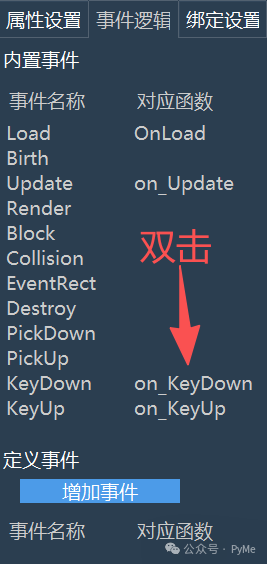 事件列表下方,还有个"增加事件"按钮,用户也可以在这里增加自定义事件函数。在这里我们需要为KeyDown增加事件处理,只需要双击KeyDown属性栏的值,即可进入到代码编辑器: