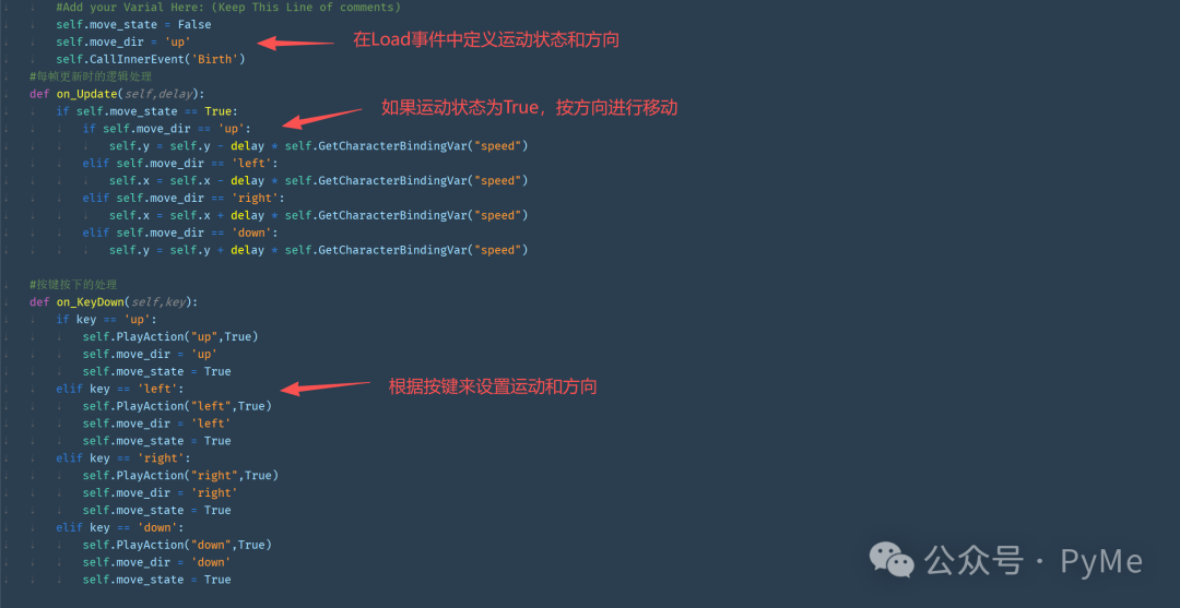 请大家想一想,这里为什么要用and来同时判断mov_dir,而不是直接判断key就设为停止?你知道么,欢迎在评论区回复,我将对第一个答出来的小伙伴赠送10个PyMe AIGC豆哟~