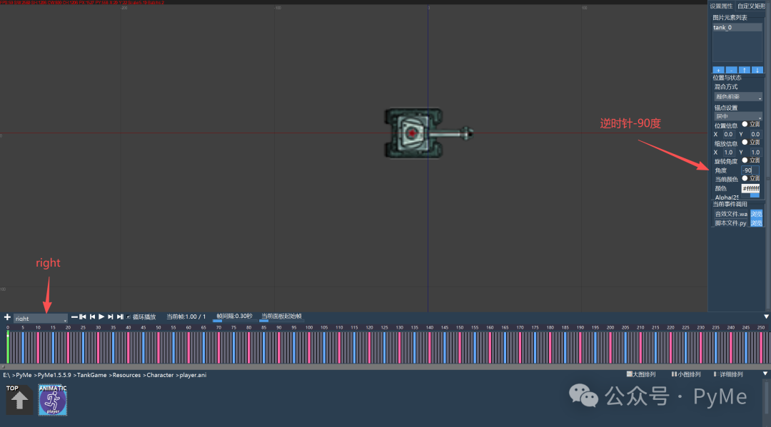 继续创建出left,right,down三个动作,因为pygame旋转是逆时针,所以根据方向设置旋转逆时针角度。