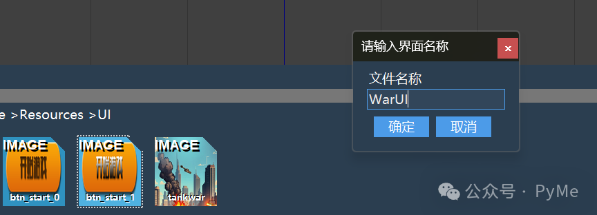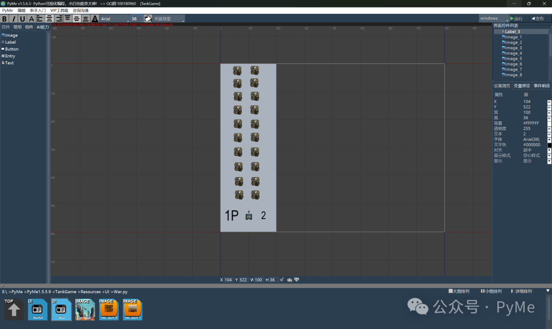 在当前文件夹下右键单击,弹出输入界面名称,输入WarUI后点击确定新建游戏界面WarUI,我们将Form_1设为200宽,600高,并从左边工具条拖动创建出显示1P的信息,包括"1P"文字下的玩家坦克图标和数量文字,以及在上面摆放初始生成的20辆敌军坦克。
