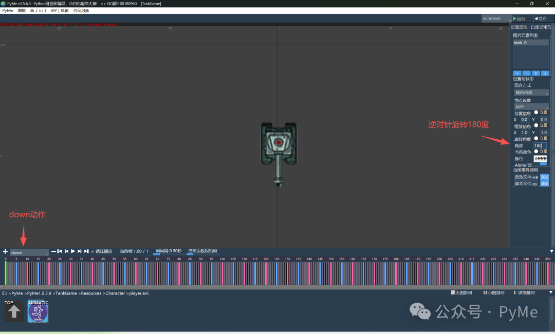 确定后可以看到"+"右边的下拉列表框出现了up动作,坦克图片显示在第一帧。