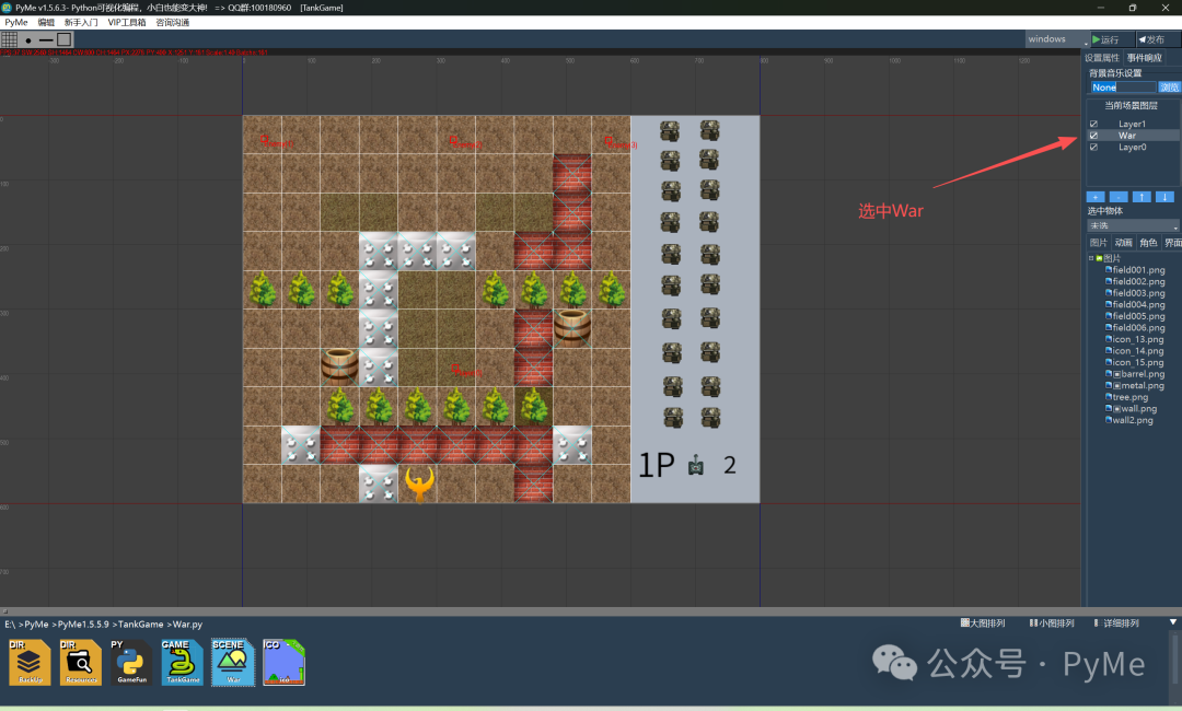 返回到场景War,然后在右边图层列表选择War图层,因为我们上一节将四个位置点放置在这个图层了,一个player位置点,三个enemy位置点,所以我们需要获取这个图层上的当前Player玩家位置点用于定位和出生一个当前玩家坦克。