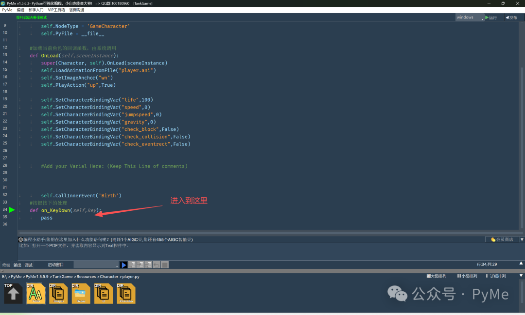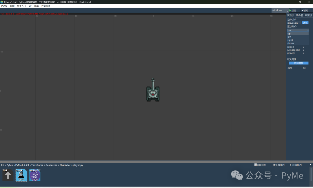 介绍完这些功能,是不是感觉PyMe还是很强大的!下面我们来处理一下坦克的移动,首先我们双击Load事件进入加载完成函数,在其中增加运动方向和运动状态变量,并在按键处理的代码中加入设置方向和状态。编写完后通过鼠标右键菜单,返回角色设计视图,在右边是响应面板的Update事件的对应函数栏双击,并在on_Update(self,delay)函数中处理更新,这里delay为浮点的秒数。