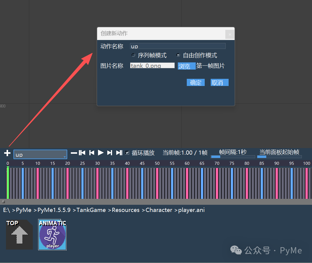 动画编辑器主要用来制作动作动画,支持创建多个动作,支持生成序列帧图片,点击左边的"+"号,在弹出对话框中选择创建新动作,填写动作名称为up,因为只有一帧,所以在这里我们使用自由创作模式,使用坦克图片tank_0.png作,点击确定。