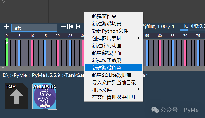 在Character文件夹下用鼠标右键单击,在弹出菜单中点击"新建游戏角色",输入player,创建角色文件player.py进入到角色编辑器中。