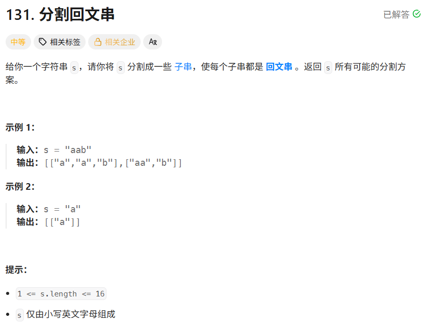首先判断这个子串是不是回文,如果是回文,就加入在vector<string> path中,path用来记录切割过的回文子串。