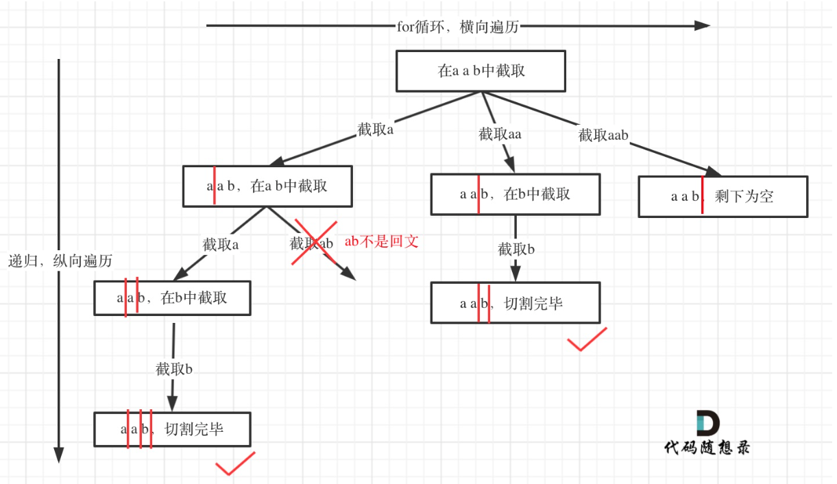 cppfor (int i = startIndex; i < s.size(); i++) { // 检查s[startIndex]到s[i]的子串是否是回文 if (isPalindrome(s, startIndex, i)) { // 获取回文子串 string str = s.substr(startIndex, i - startIndex + 1); path.push_back(str); // 将回文子串加入当前路径 } else { // 不是回文,跳过当前分割点 continue; } backtracking(s, i + 1); // 递归处理剩余子串,从i+1开始 path.pop_back(); // 回溯:移除最后添加的子串,尝试其他分割可能 }