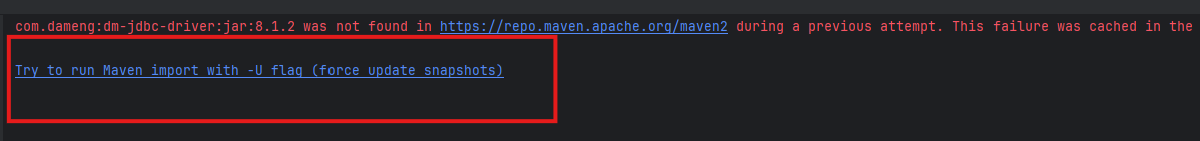 核心问题是:Maven 在中央仓库(repo.maven.apache.org)里找不到达梦驱动 com.dameng:dm-jdbc-driver:8.1.2,所以项目依赖解析失败了。