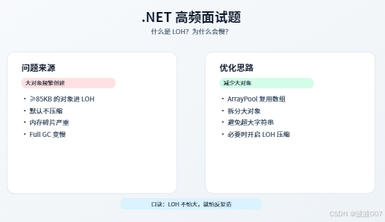 每日一题:.NET 中什么是 LOH(大对象堆)?为什么频繁使用大数组或大字符串可能导致性能问题?如何优化?