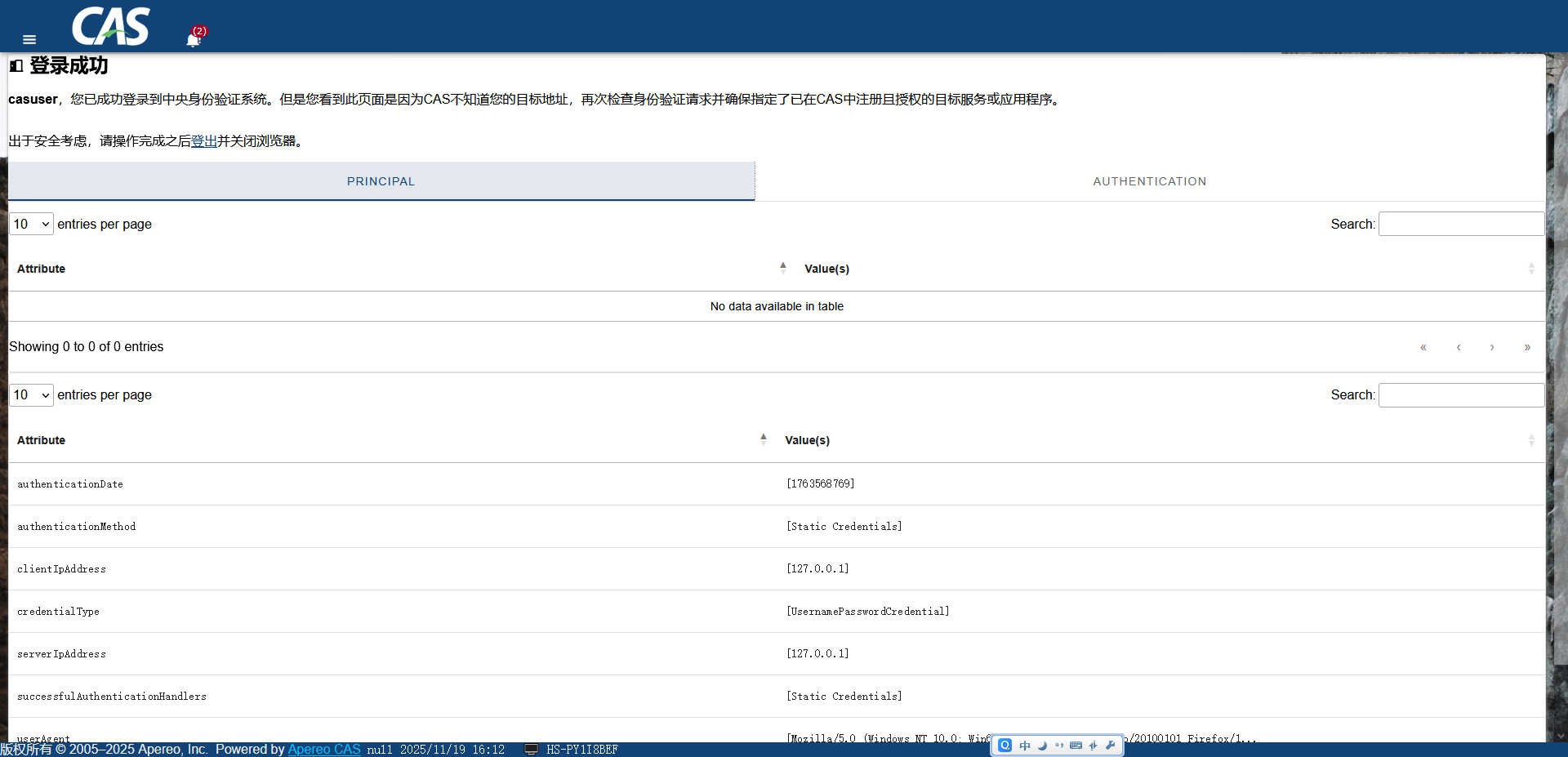 输入地址"http://localhost:8443/cas/login",输入用户名密码:casuser/Mellon,即可登录。这个用户密码对也是在该配置文件中配置的,往下翻可以找到。