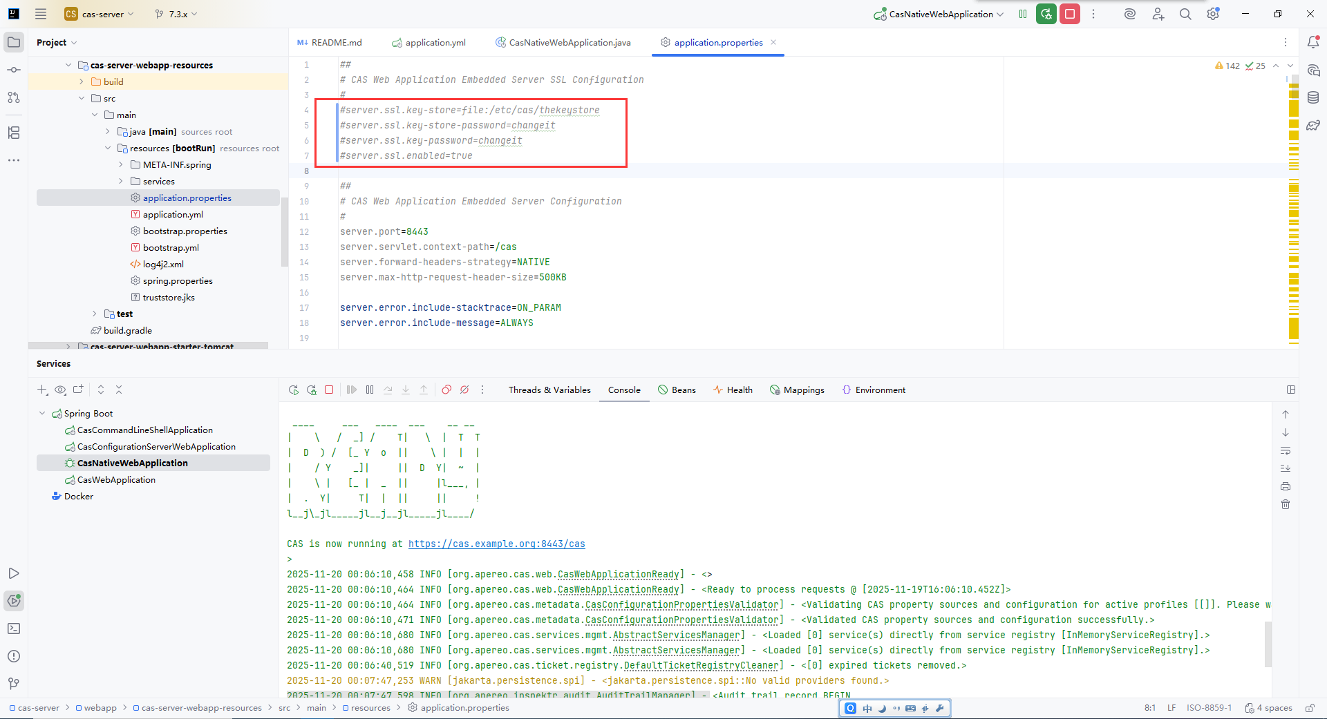 我们注释掉webapp下cas-server-webapp-resources目录下的application.properties中下面几个属性,在重新启动,终于是启动成功: