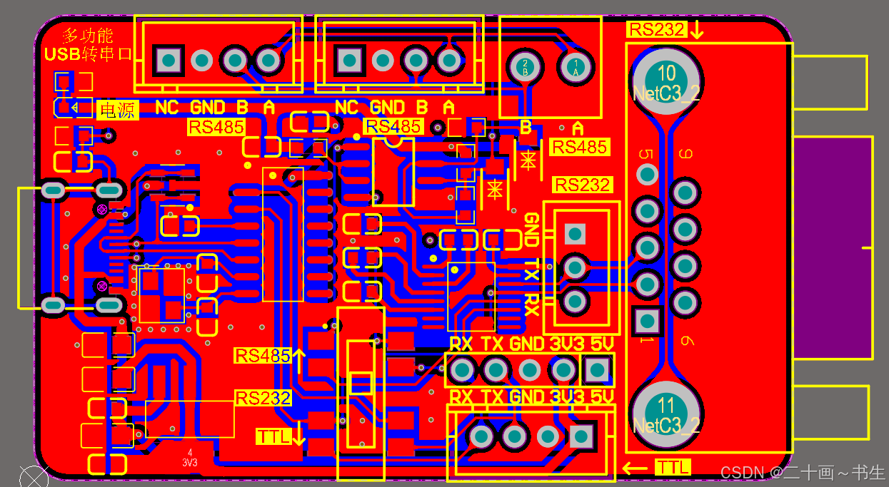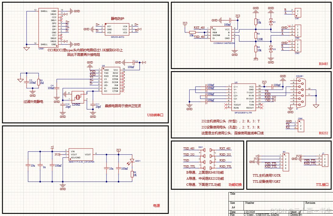 嘿,各位电子发烧友和好奇宝宝们!想不想在电子小项目的奇妙世界里大展身手,却又苦于不知从何下手?别愁啦!今天就给大家带来一个超有趣的小项目------多功能 USB 转串口模块电路。这电路可不简单,它就像个"串口魔法大师",有静电防护的"金钟罩",CH340G 芯片这位"核心大将",还能在 RS485、RS232、TTL 这些串口间自由切换,更有电源转换和功能切换的神奇本领。接下来,咱们就一起钻进这个电路的"肚子"里,把它的小秘密都挖出来!
