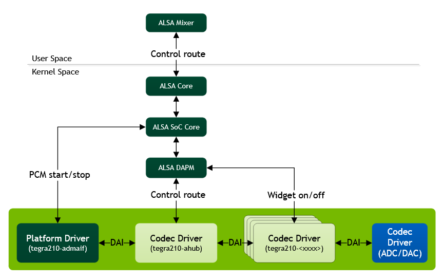 在 Jetson 设备中,音频设备的配置和管理通常通过 Device Tree 来完成。设备树 (dts/dtsi 文件) 定义了硬件配置,告诉操作系统和驱动程序如何与硬件交互。在音频开发中,主要涉及音频编解码器、I2S 总线、时钟源以及音频路径等设置。