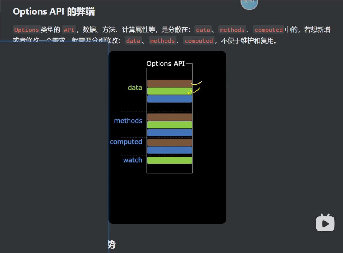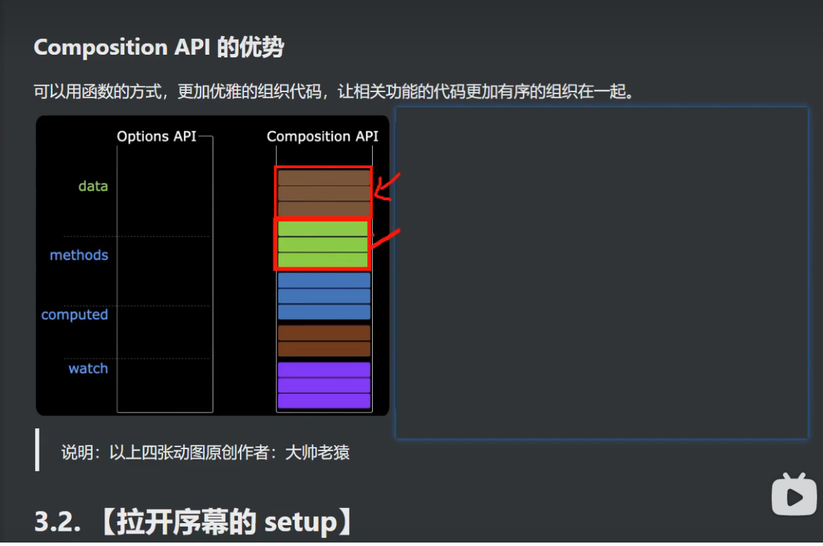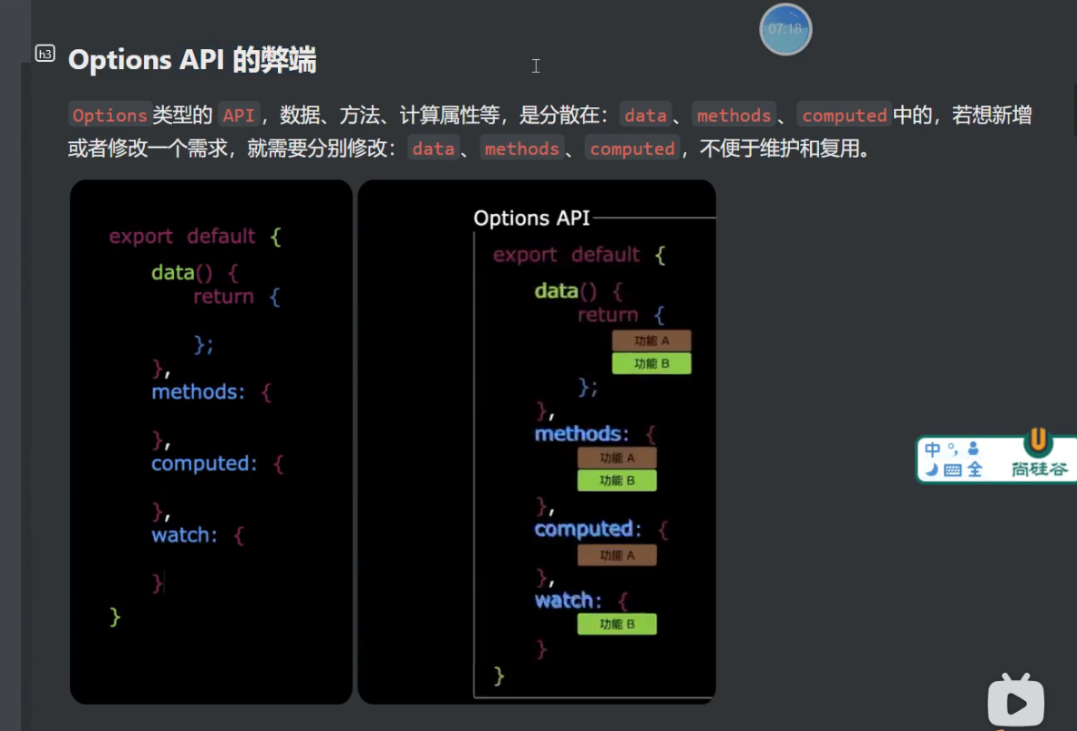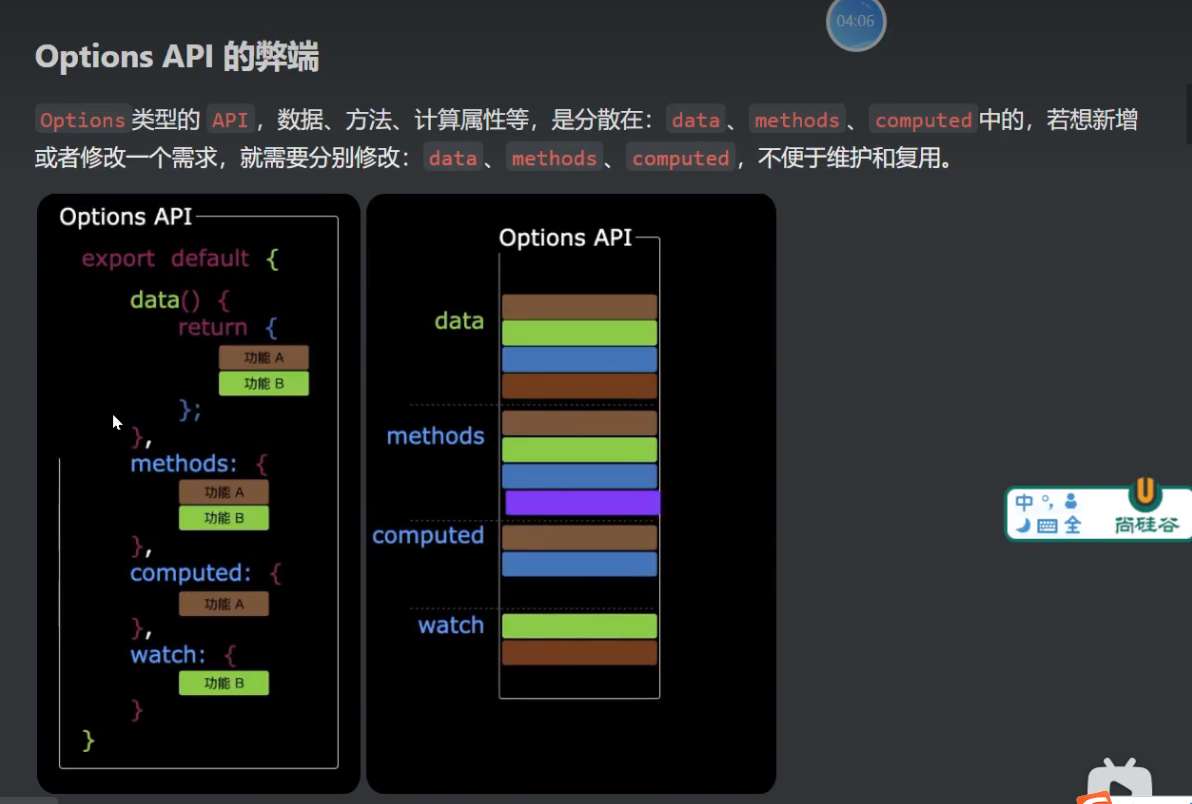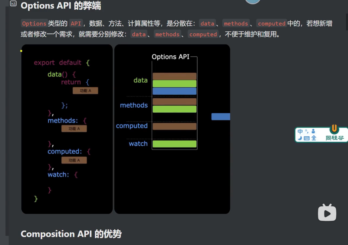 绿色功能的函数包含着:数据,方法,计算属性,监视,包含了很多很多的东西,此时他就集中了,以后要修改绿色功能,你只需要找到该函数就可以修改了,不用在满世界去寻找 data,methods,computed等
