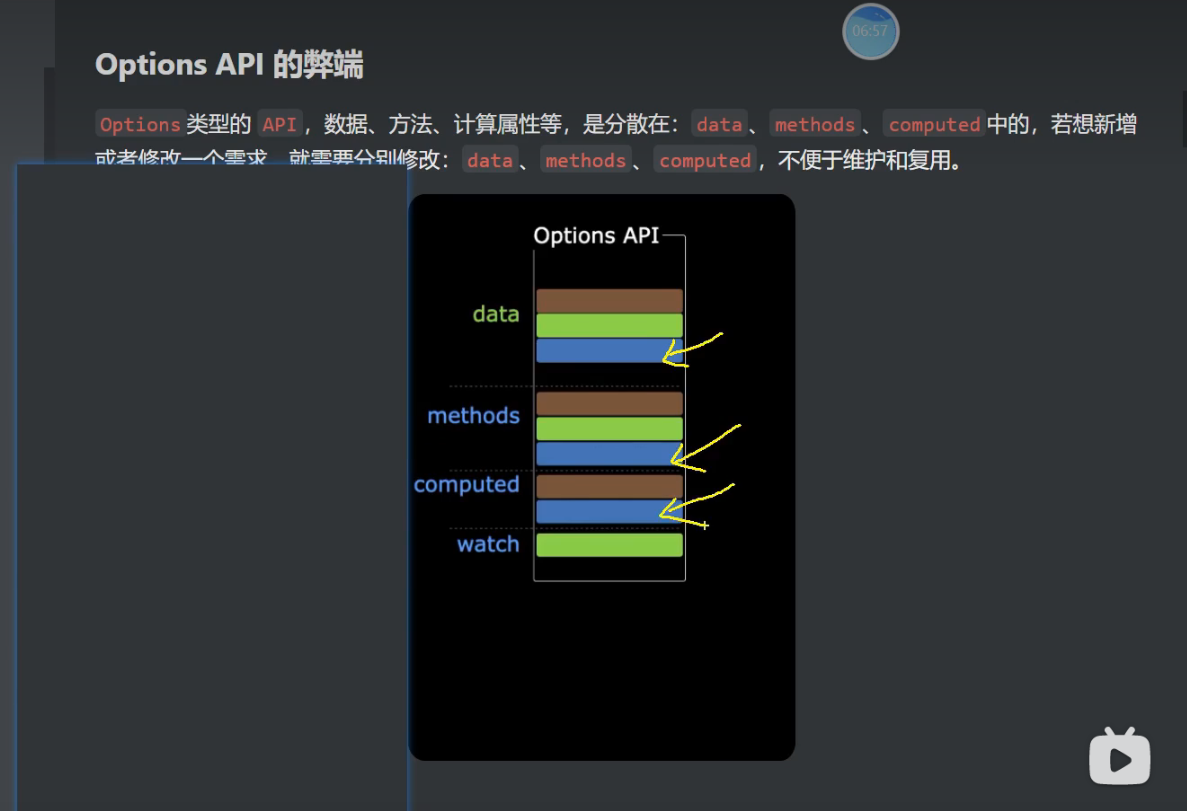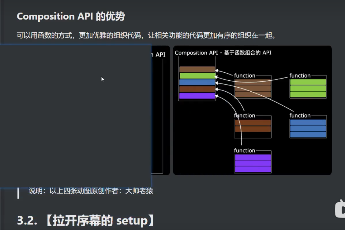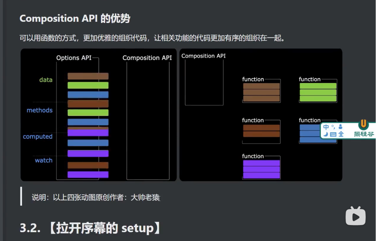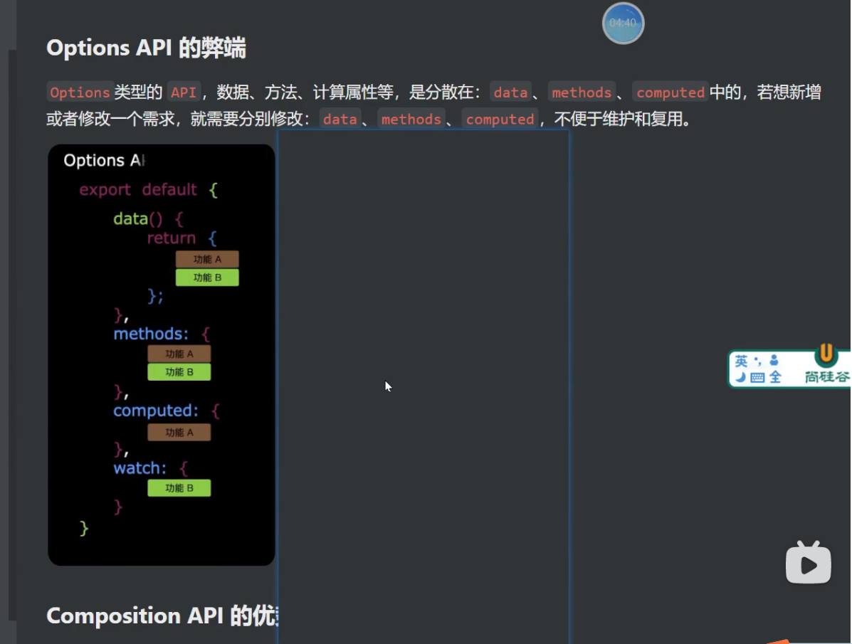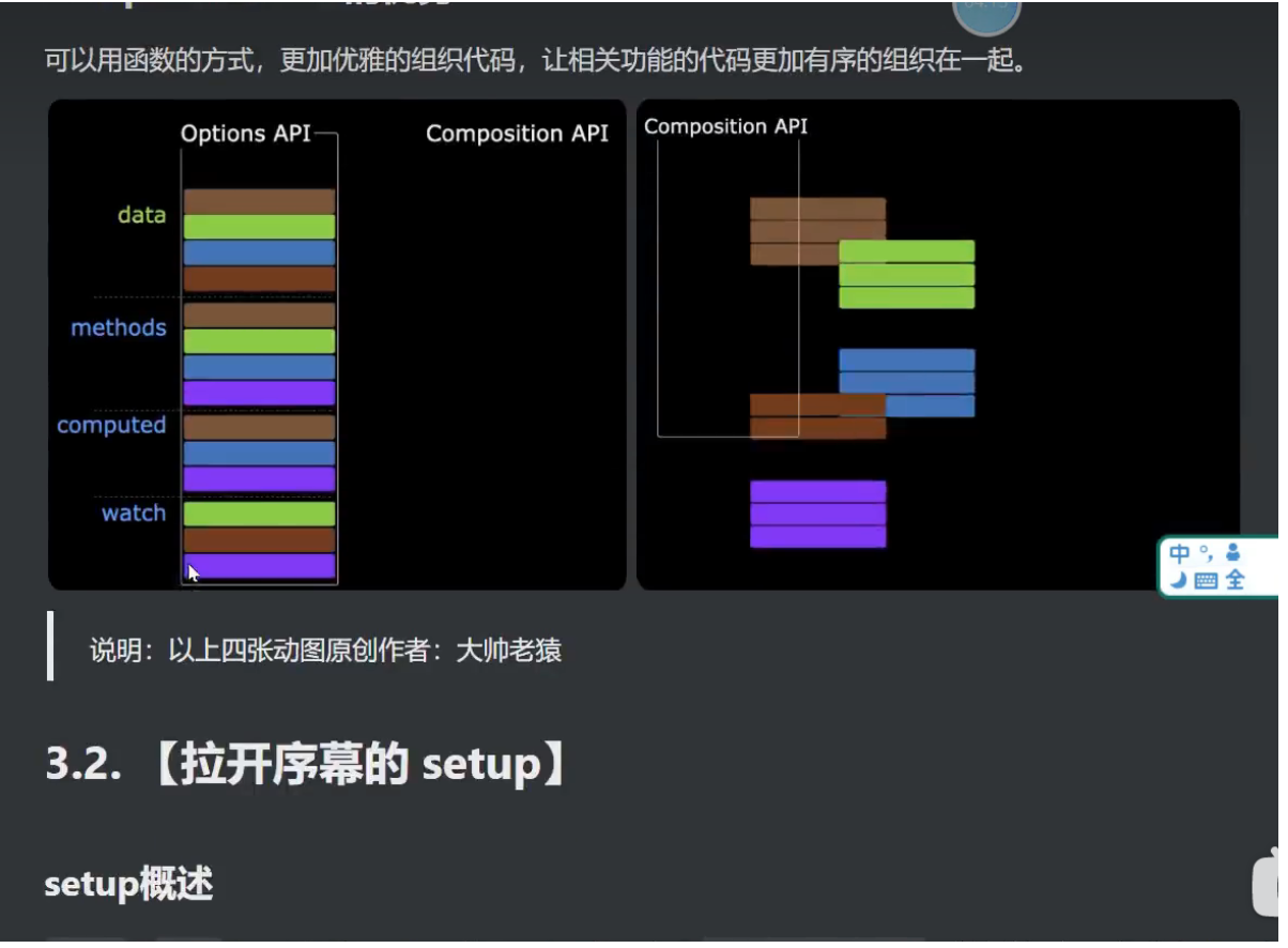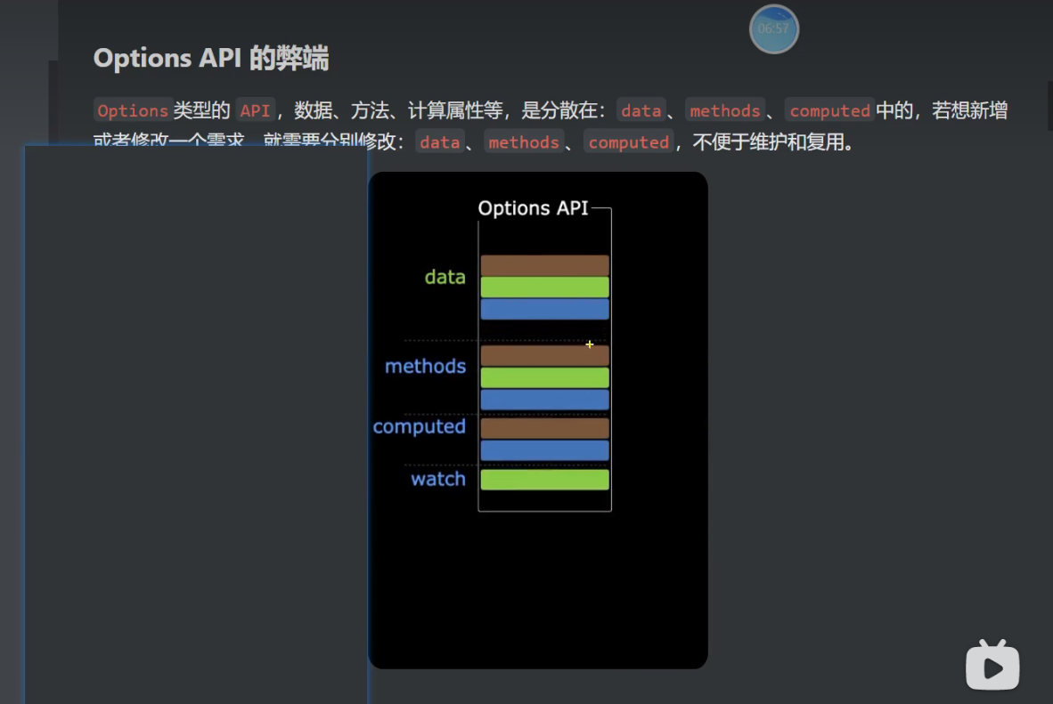绿色功能的函数包含着:数据,方法,计算属性,监视,包含了很多很多的东西,此时他就集中了,以后要修改绿色功能,你只需要找到该函数就可以修改了,不用在满世界去寻找 data,methods,computed等