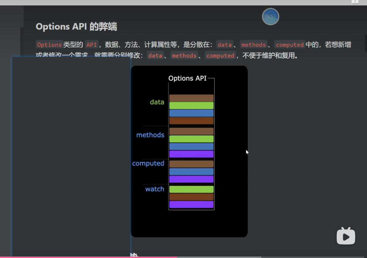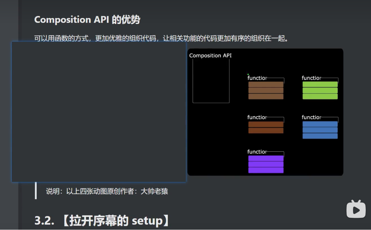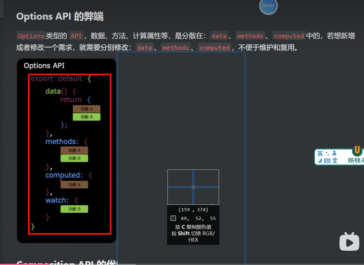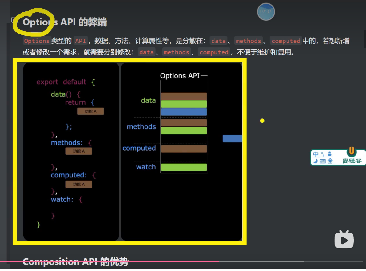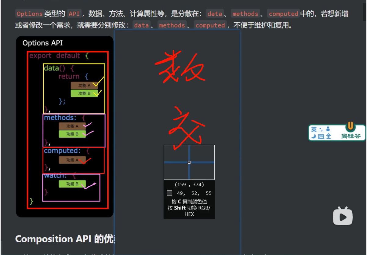 绿色功能的函数包含着:数据,方法,计算属性,监视,包含了很多很多的东西,此时他就集中了,以后要修改绿色功能,你只需要找到该函数就可以修改了,不用在满世界去寻找 data,methods,computed等