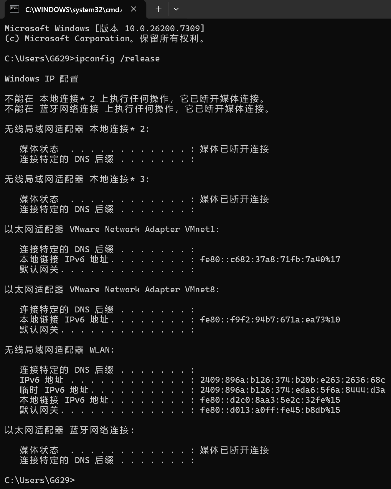 在命令提示符窗口中输入 ipconfig /release后按回车键执行该命令。