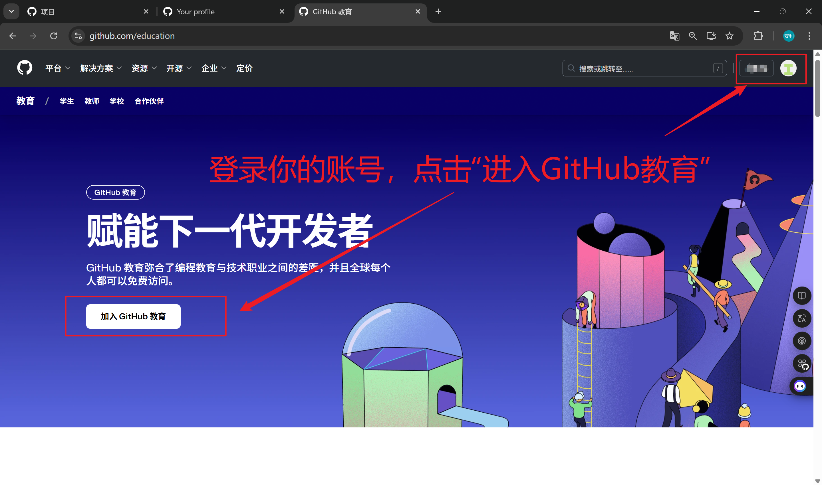 在 Google Chrome 浏览器地址栏输入网址,登录账号即可访问 GitHub 教育平台。