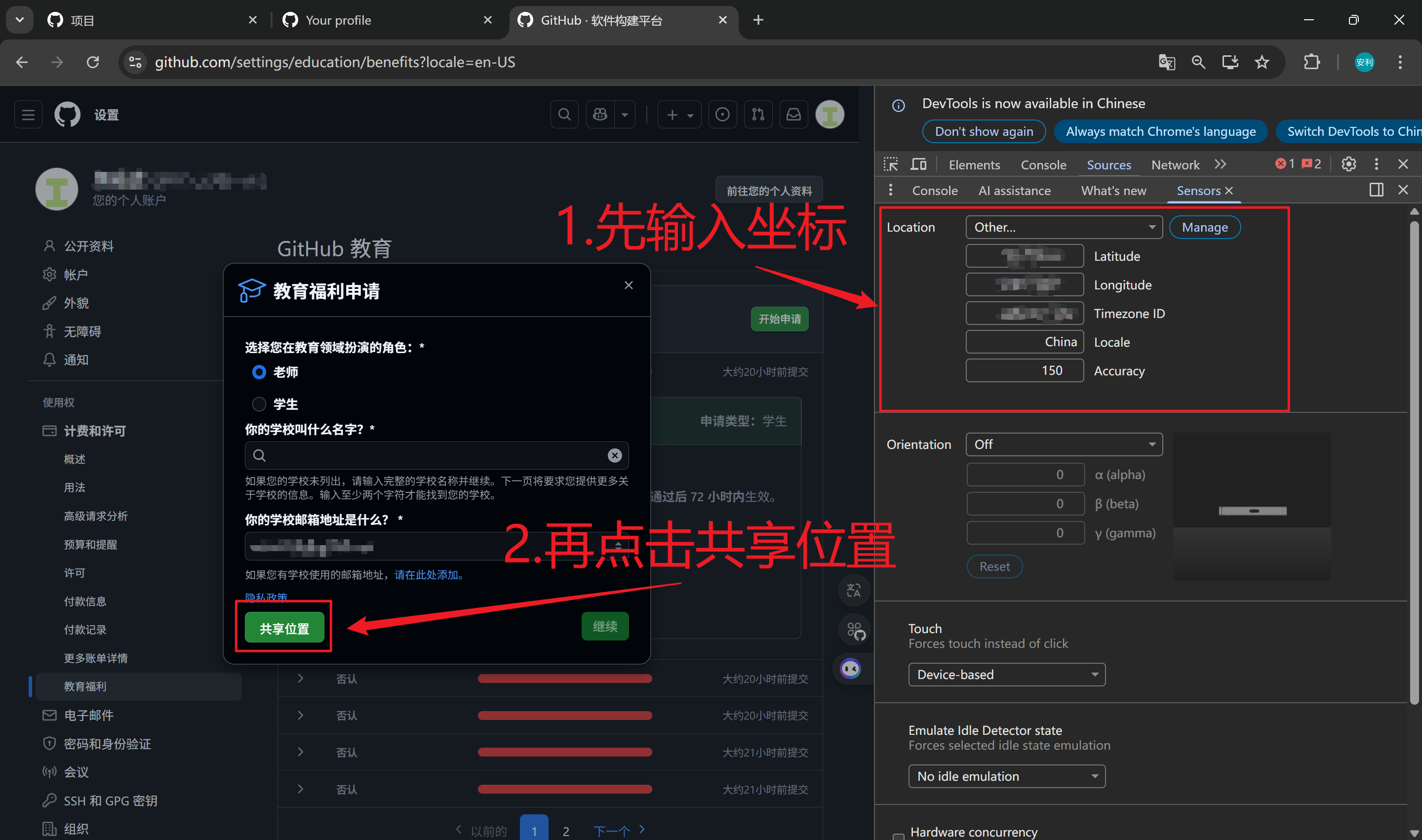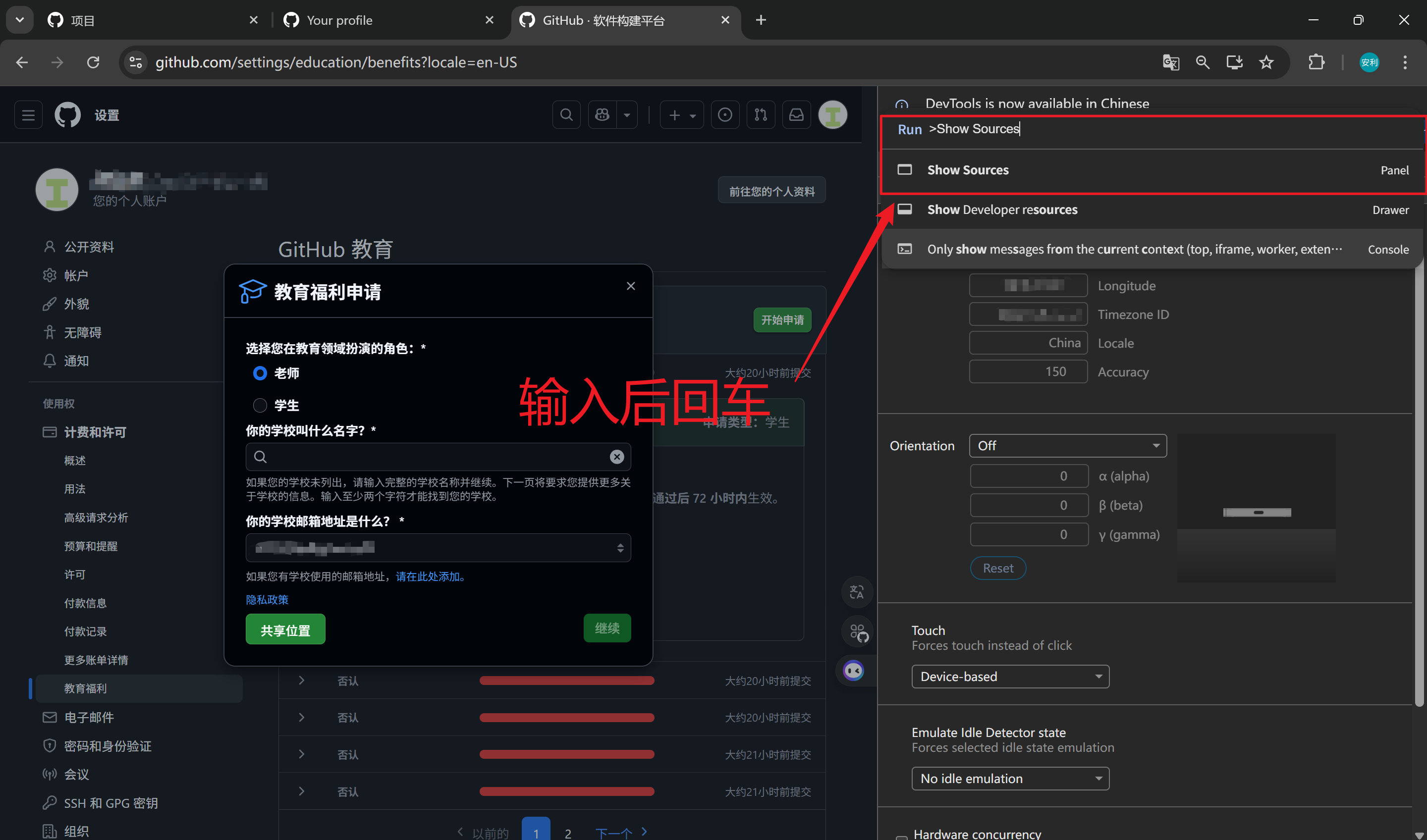这里注意!!!注意!!!关掉VPN 后按F12 (或者Fn + F12 ),再按Ctrl + Shift + P ,搜索 Show Sources 回车。Location 选择 Other... ,然后填写你的学校坐标等信息,再点击 共享位置,这里必须按顺序进行!!!