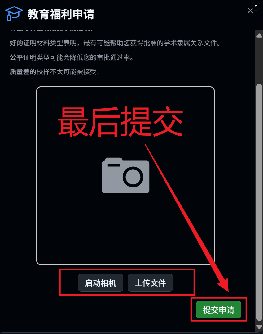 请继续下滑,上传之前准备好的学籍证明文件,然后点击 提交申请 按钮完成操作。