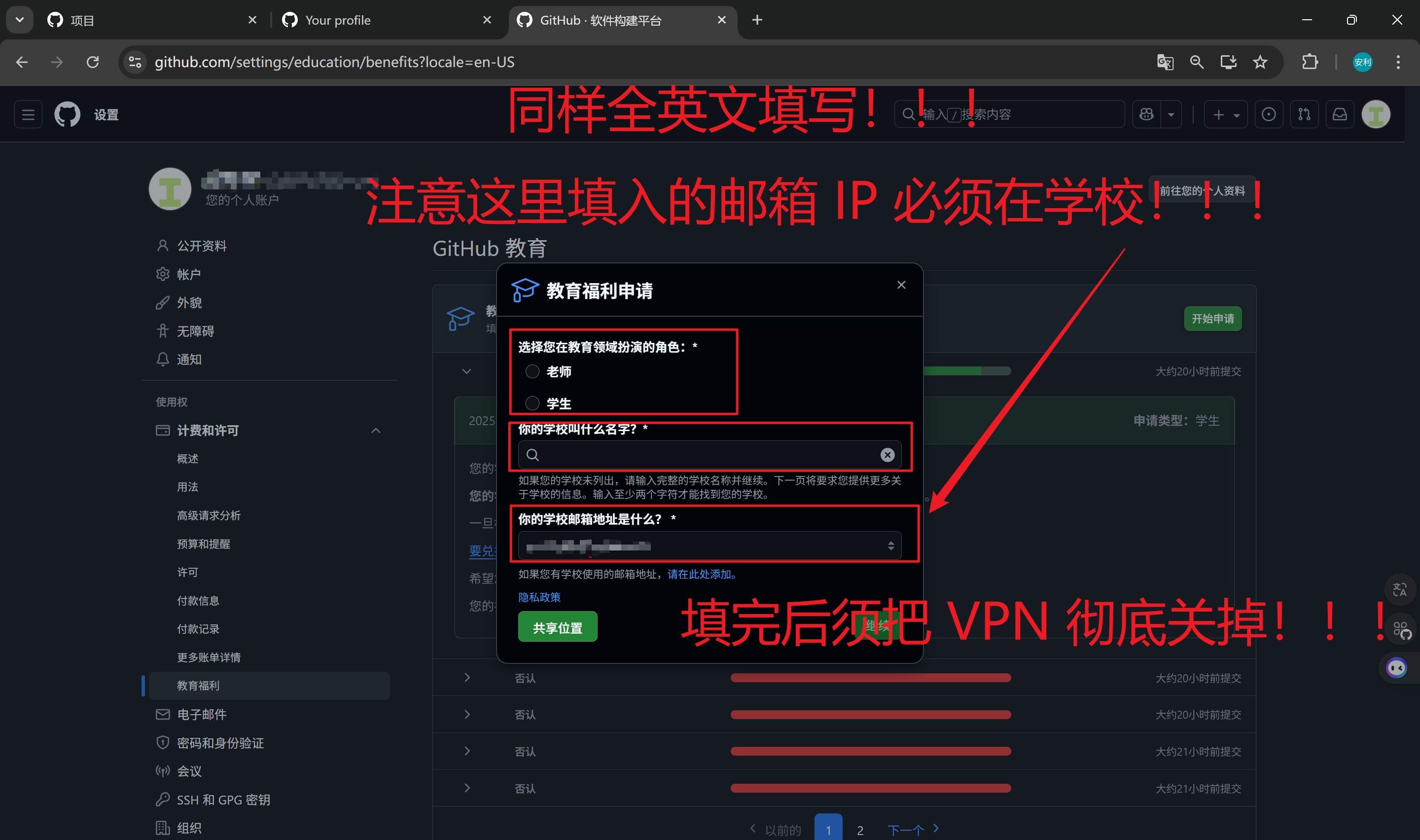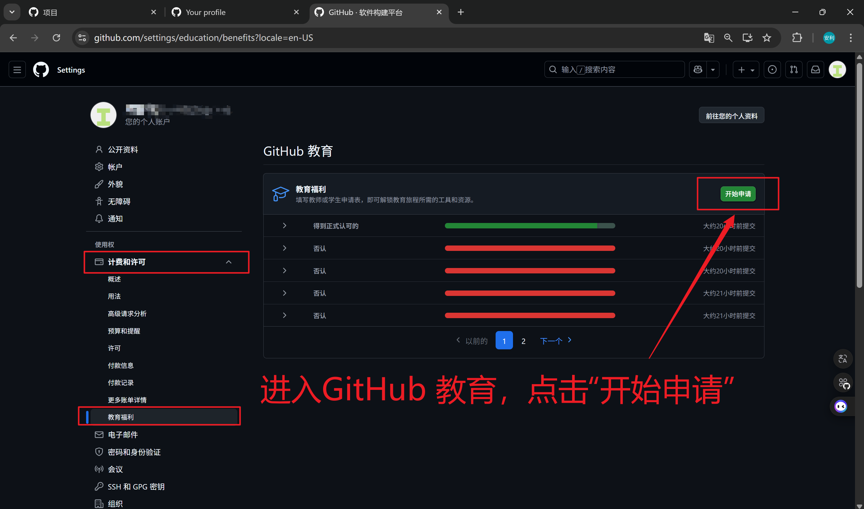 成功提交申请后,请返回 GitHub 教育 页面查看审核结果。若申请未通过,请根据系统提示修改后重新提交。笔者也是经过多次尝试才最终成功,建议保持耐心并持续尝试。