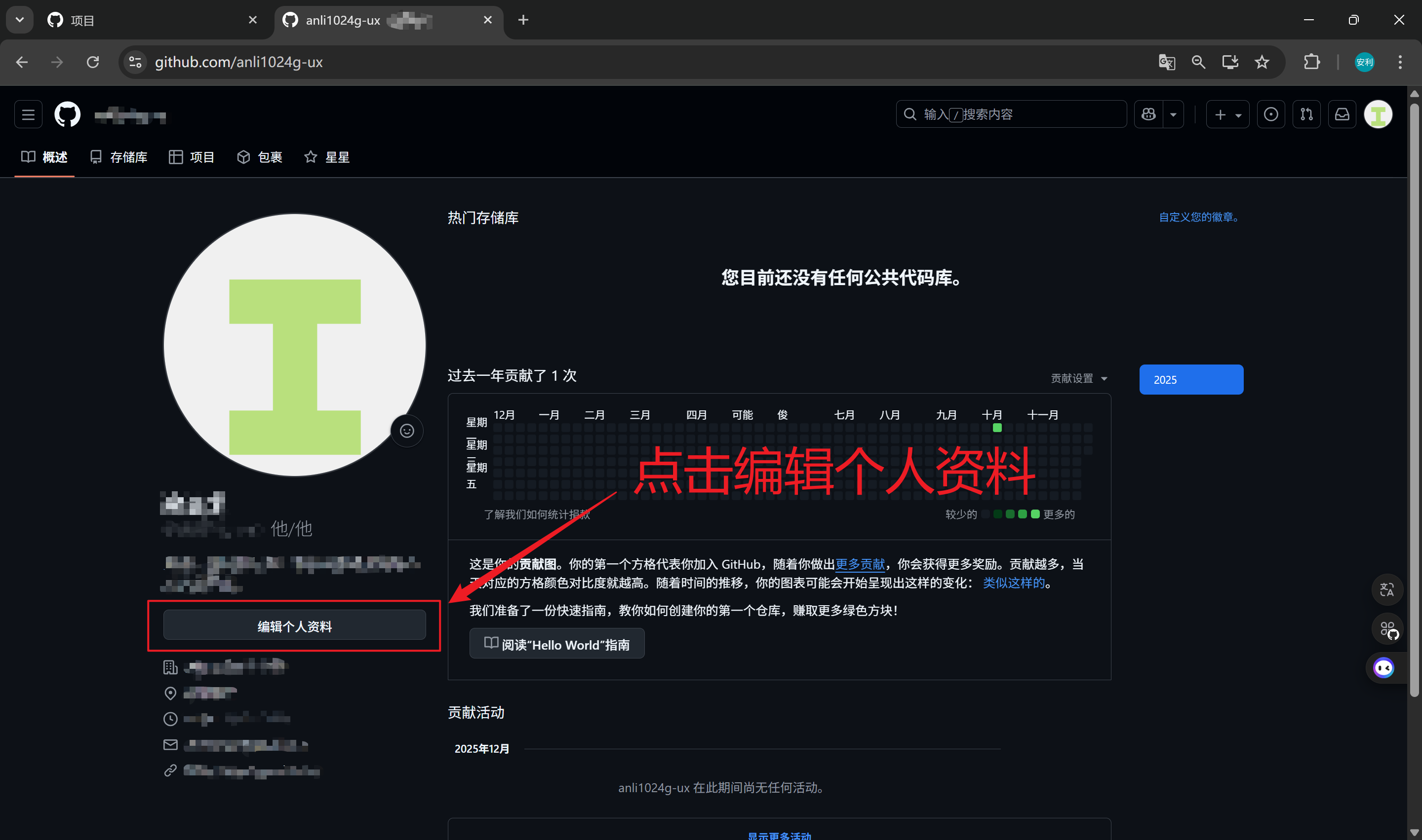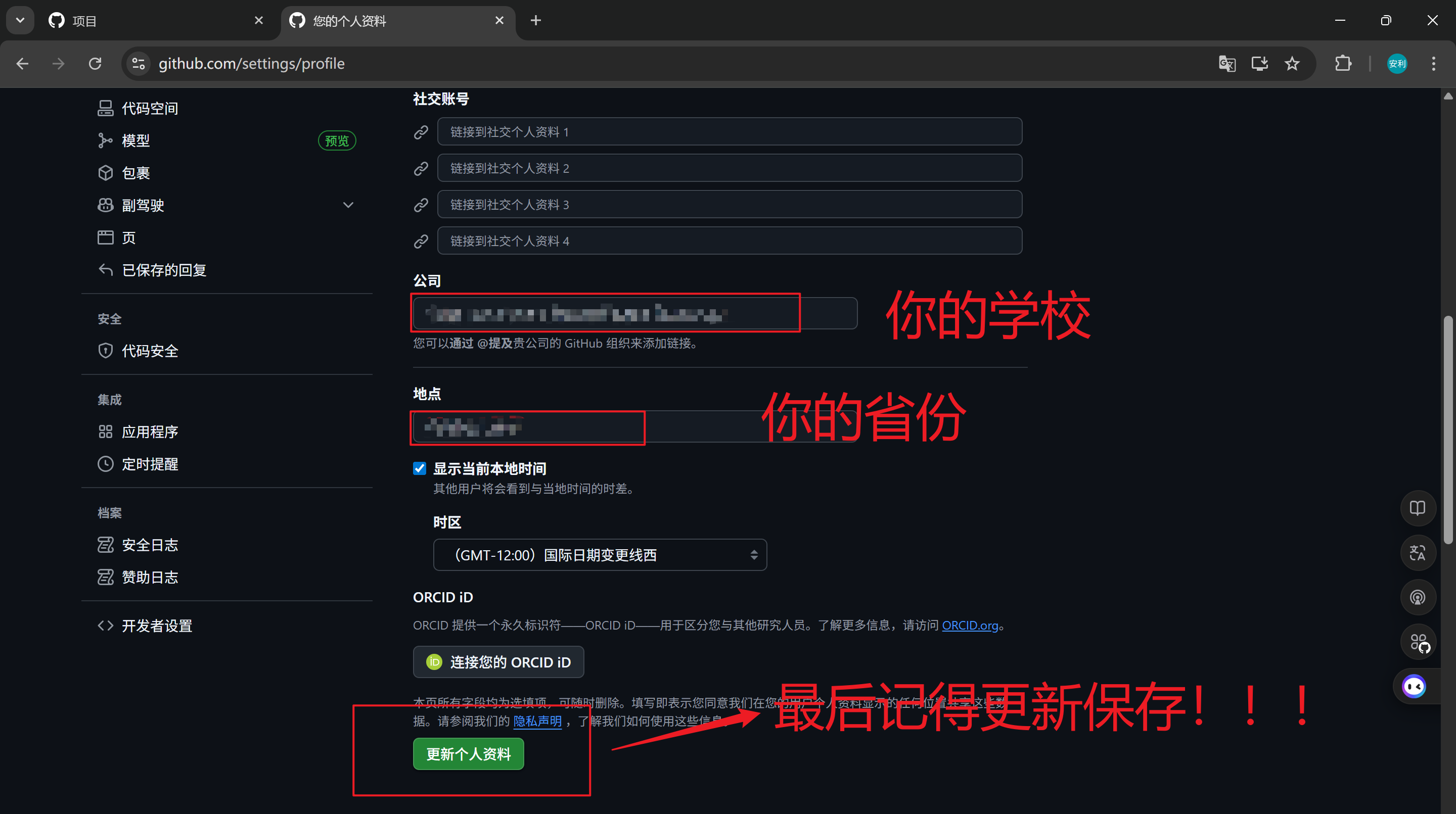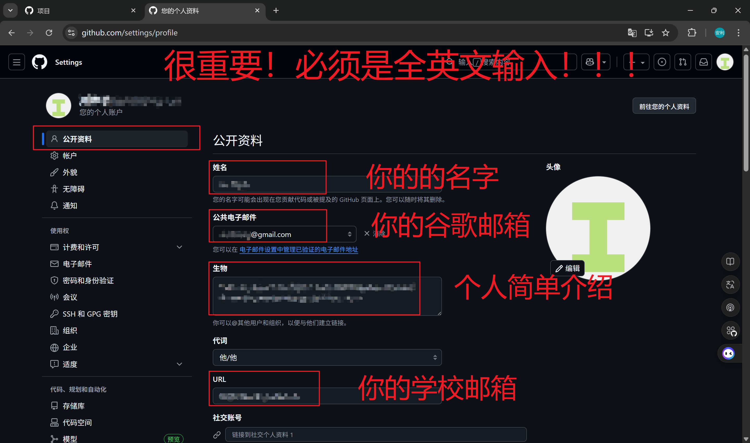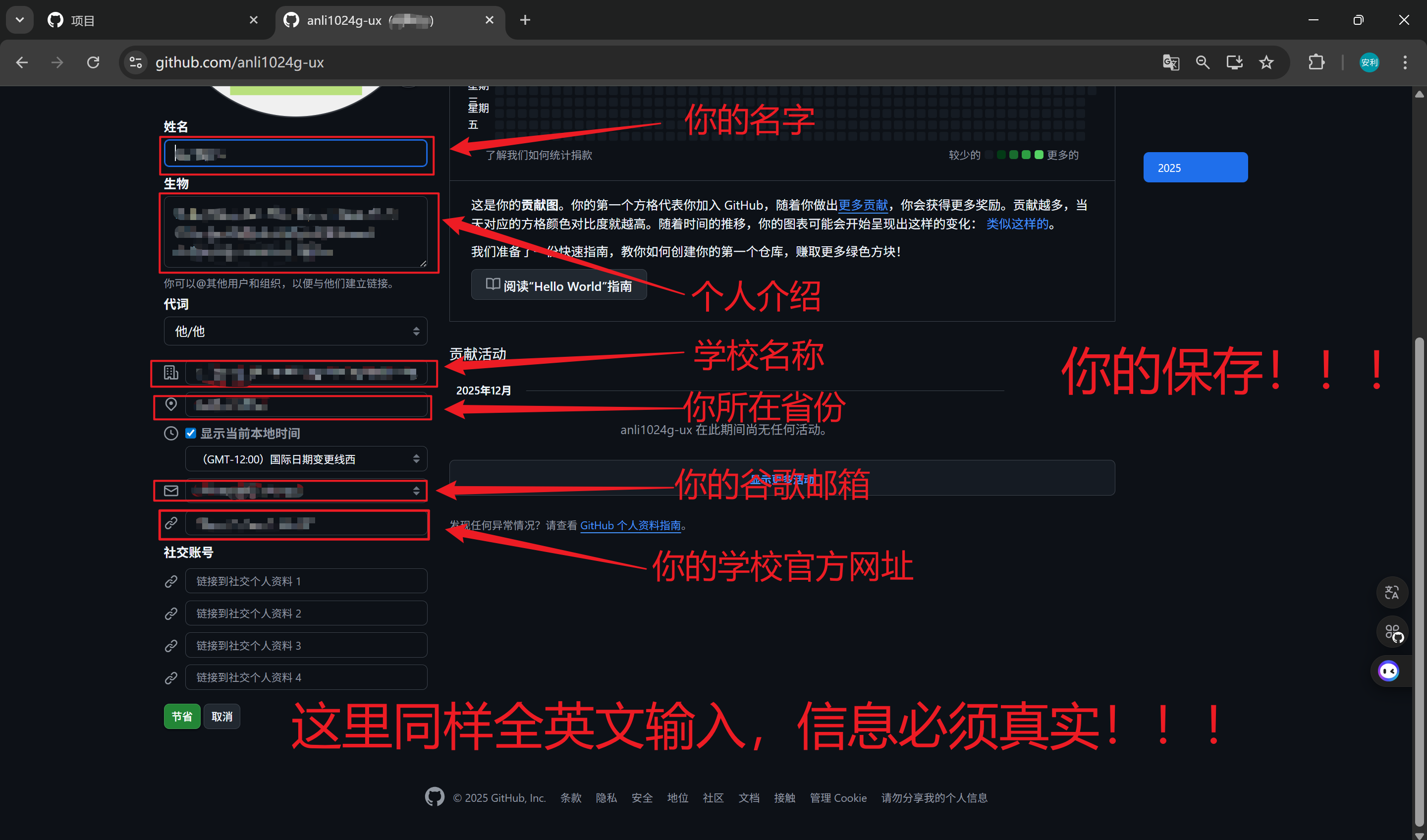 进入 编辑个人资料页面,内容必须全英文输入!!!