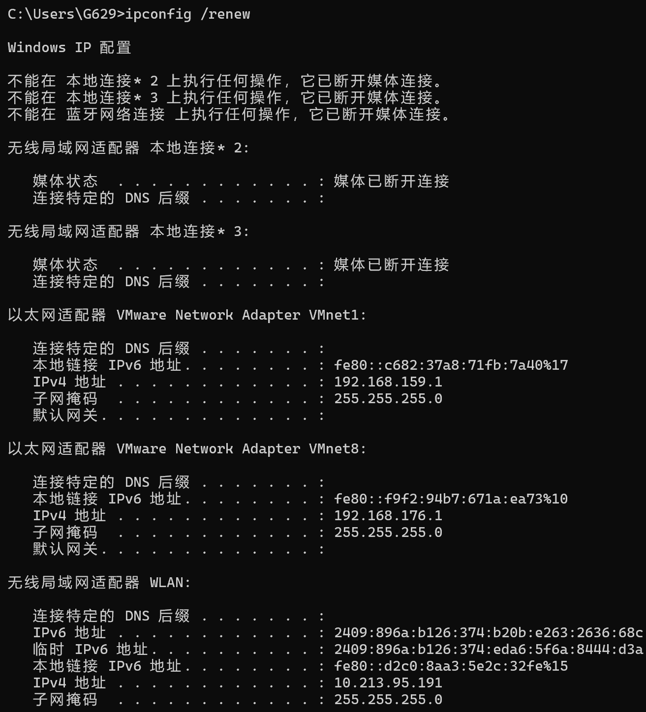 在命令提示符中输入 ipconfig /renew 并按回车键执行。