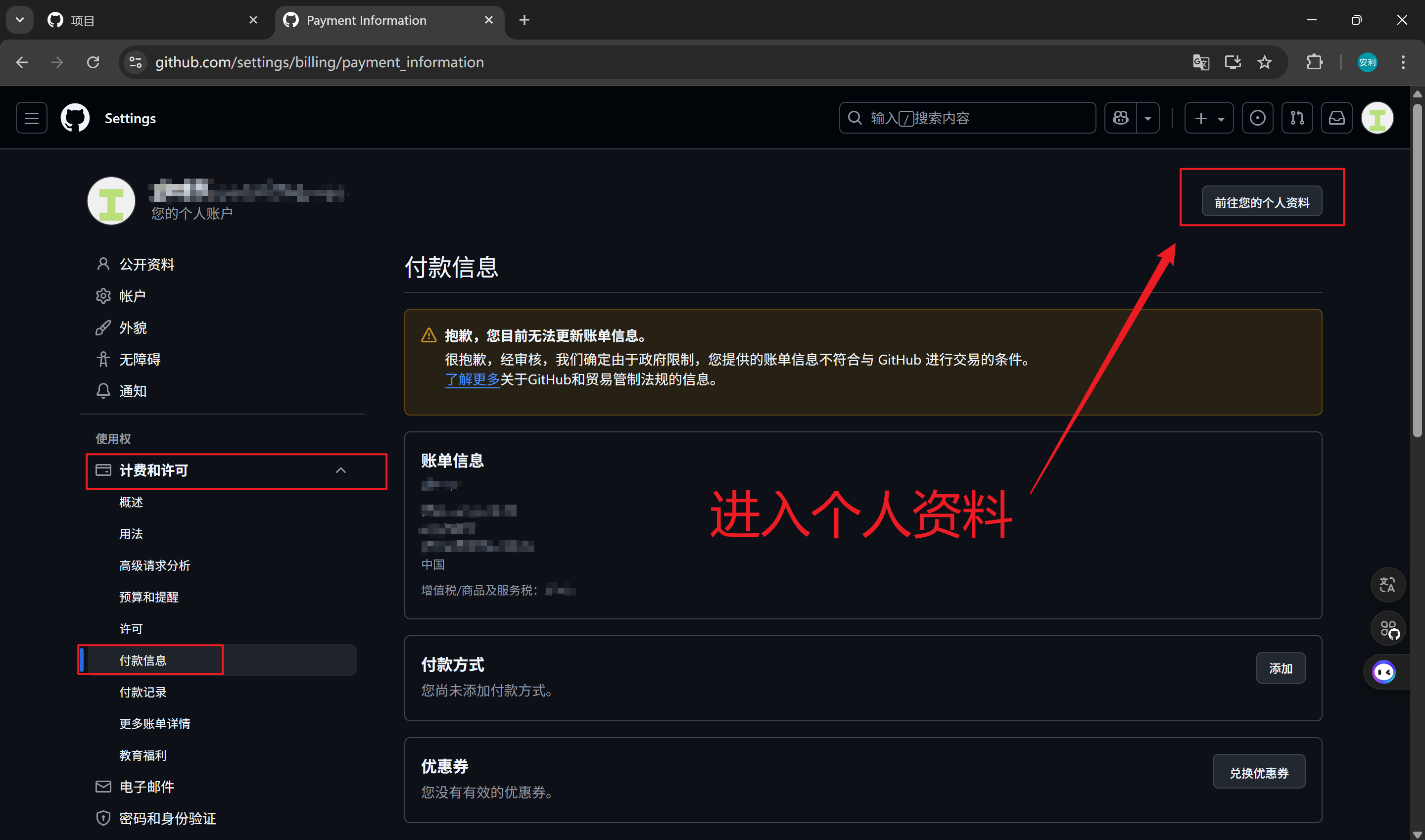 请前往 计费和许可 → 付款信息 ,点击 前往您的个人资料进行编辑。若无法进入编辑页面,可能是账号被锁定,建议重新注册并登录账号后再次尝试上述操作。