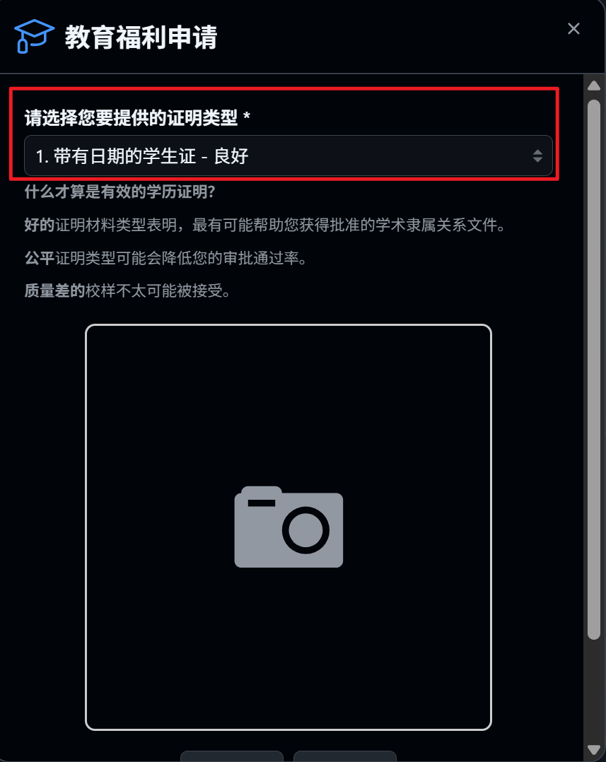 请确认信息无误后点击 下一步 ,在证明类型中选择 1. 带有日期的学生证-良好 。