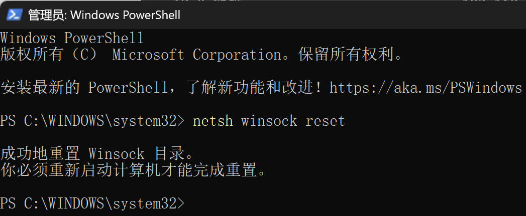 请以管理员权限打开 PowerShell 终端,执行命令 netsh winsock reset 后按回车键确认,最后重新启动计算机即可。