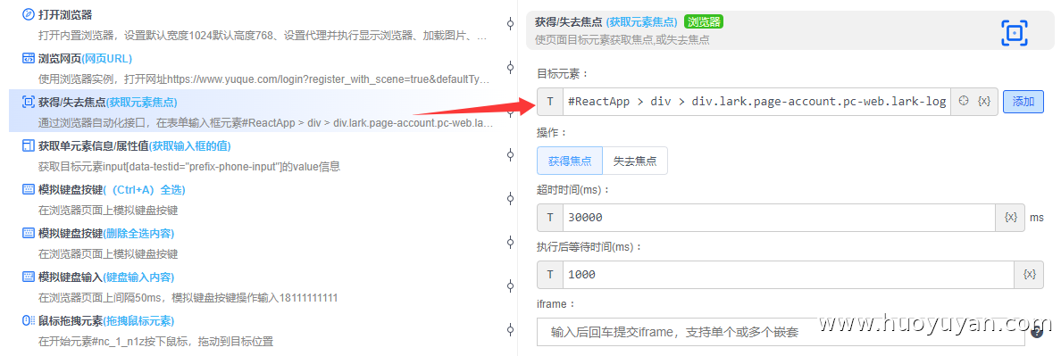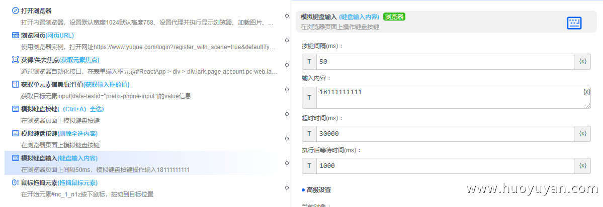 - **解决策略:**先用「获取 / 失去焦点」组件激活输入框,再通过「模拟键盘输入」组件完成内容填写;