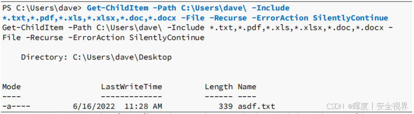 我们将目标锁定在用户 dave 的主目录,尝试搜索常见的文档与文本文件。执行以下 PowerShell 命令: