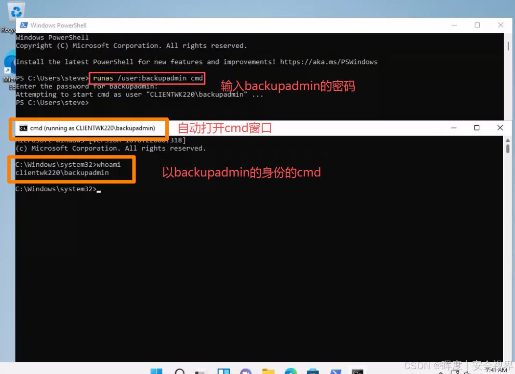 在图形界面中使用 Runas 命令,以 backupadmin 身份启动新的命令提示符。 |