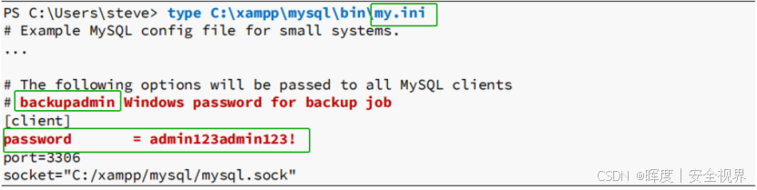 现在,成功读取 my.ini 文件的内容。其中发现手动的数据库密码 :admin123admin123!。更关键的是,文件内的注释明确指出: