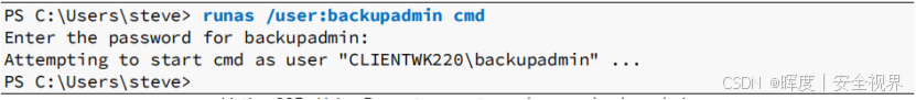 steve会话中,尝试**++使用runas++** 或其他方法,以backupadmin身份执行命令。 -