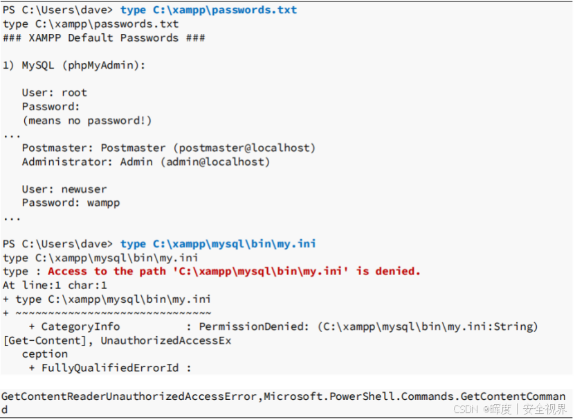 passwords.txt文件检查经查看,该文件仅包含 未经修改的XAMPP默认密码。这些是公开的已知密码,在安全评估中价值有限。
