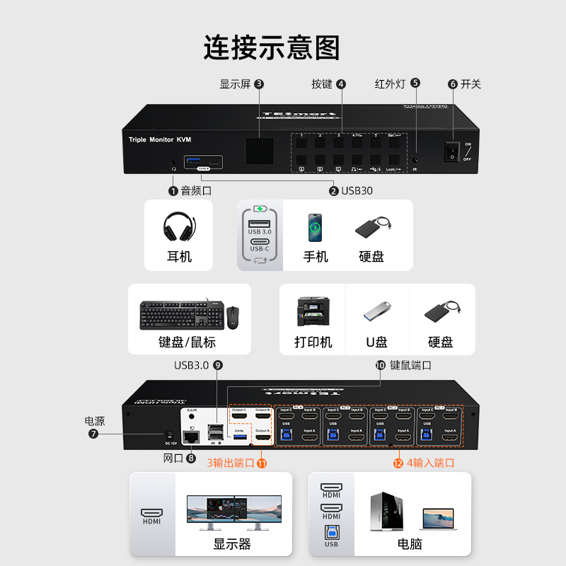 这款KVM切换器新增LAN端口,支持以最高100 Mbps的速度将4台计算机稳定接入网络。这对于需要网络连接的任务至关重要,确保流畅的在线体验。它允许使用一套键盘、鼠标和三台显示器共享最多4台台式机或笔记本电脑。支持高分辨率输出,包括3840x2160(4K)@60Hz、3440x1440@100Hz和2560x1440@144Hz,适用于工作、影音和游戏等多种场景。配备3个USB 3.0端口(含1个USB-C端口),其中2个支持充电功能。相比传统KVM切换器,该产品具有诸多独特功能和优势,适用于各种使用场景。