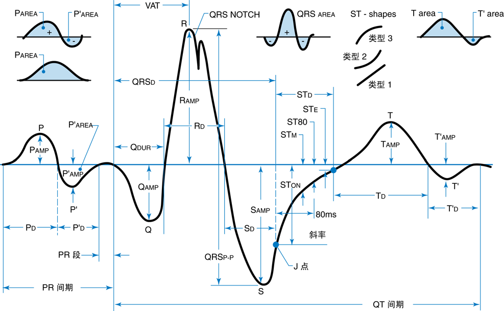 心电算法第一步就是分析心电图波形的幅度、持续时间、形态以及相关节律。这里需要测量的数据包括 P 波、QRS 复合波、ST 段、T 波的振幅、持续时间、面积和形状。