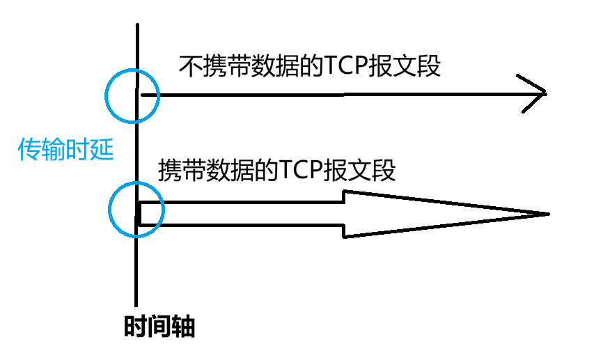 注意:虽然图中所有报文段都只用一条线画出表示,但是当该报文段有携带数据时,应该考虑它的传输时延(也叫发送时延,是指将数据全部发送到信道上所需要的时间),当它只有TCP头部时,可以忽略它的传输时延。