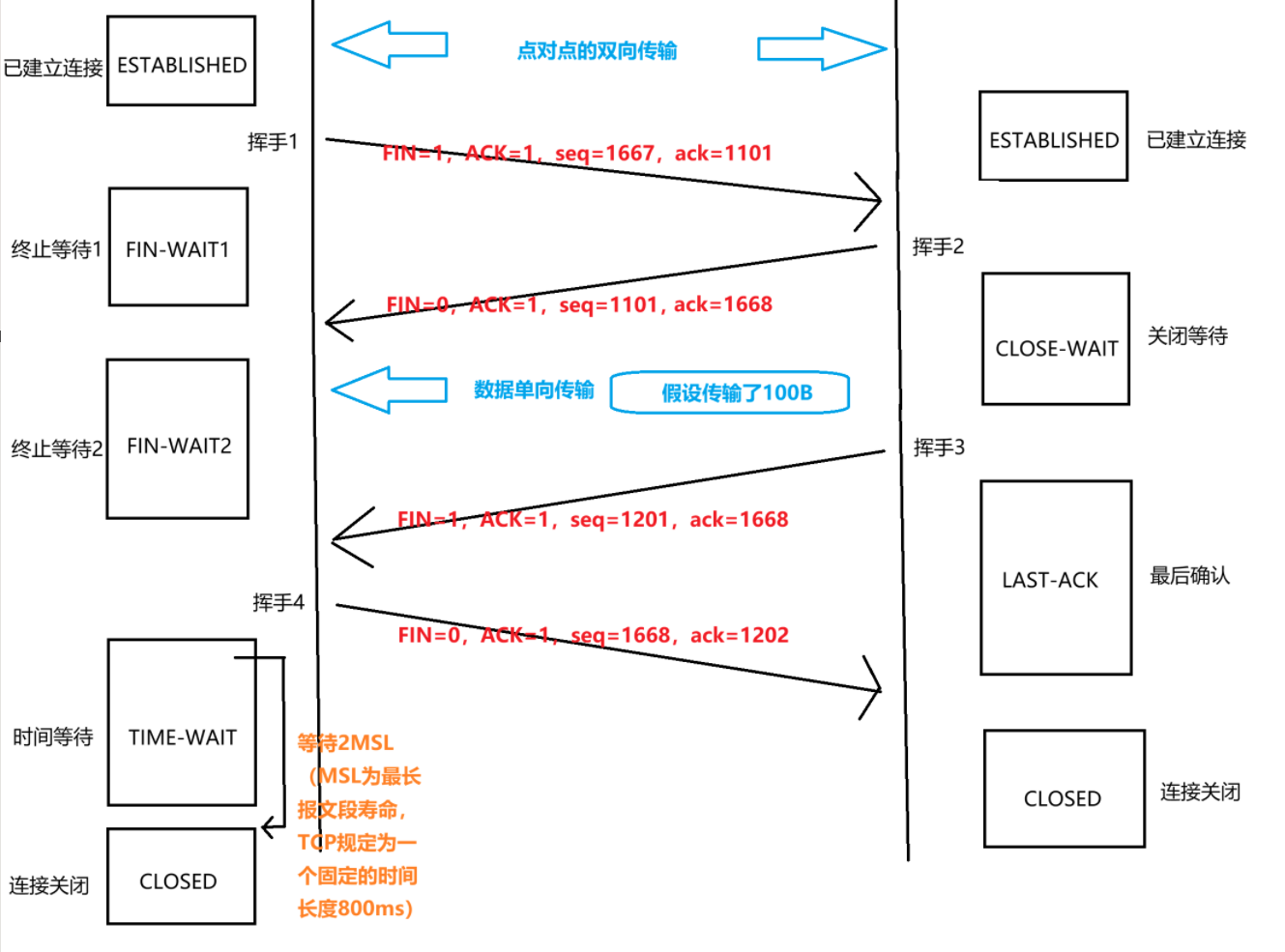 释放连接的报文段中,主要关注FIN,ACK,seq和ack的值。