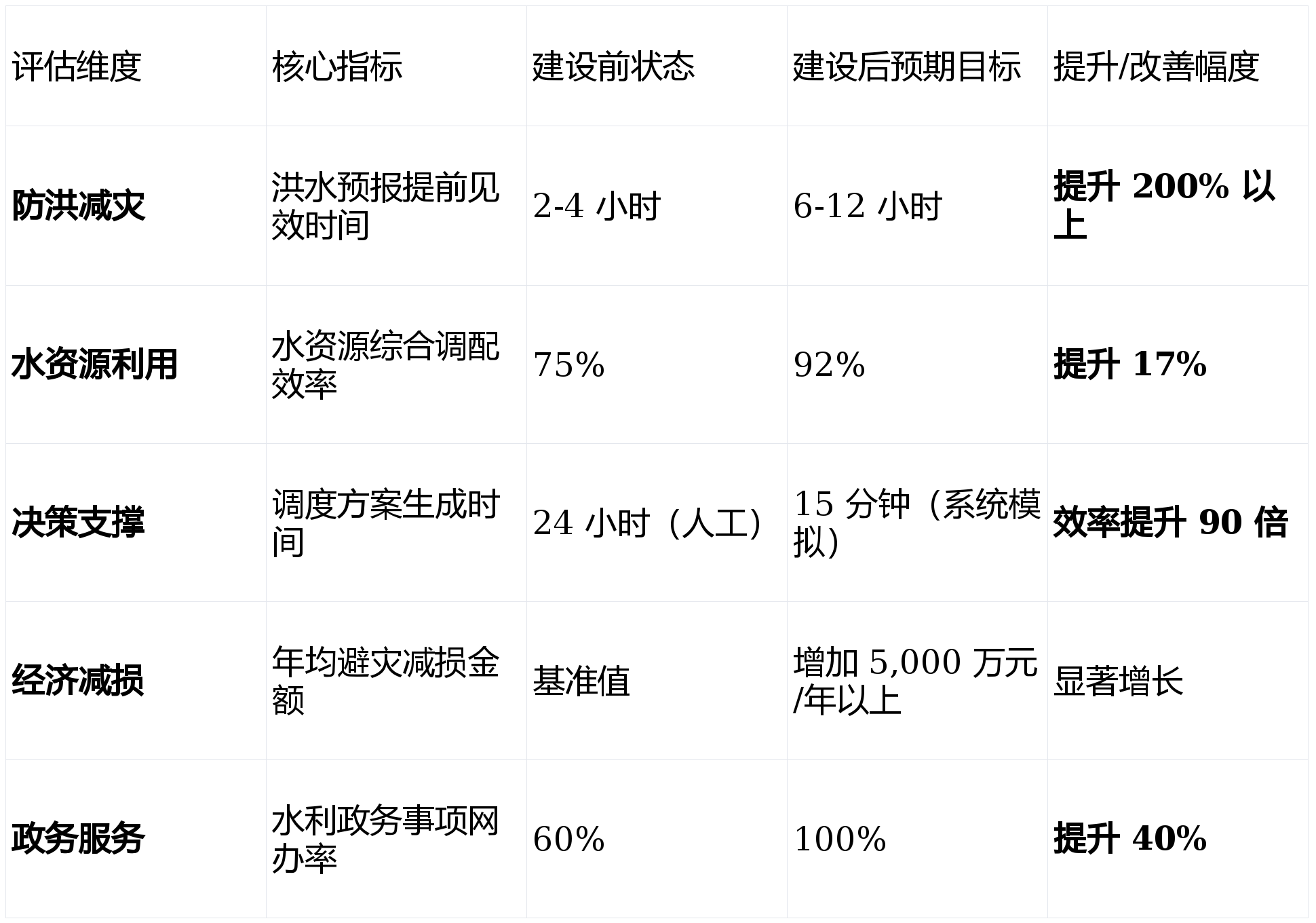 - 公共安全 :洪水预报提前见效时间从2-4小时提升至6-12小时,提升200%以上。预警信息"最后一公里"触达率提升至100%,极大保障人民生命财产安全。