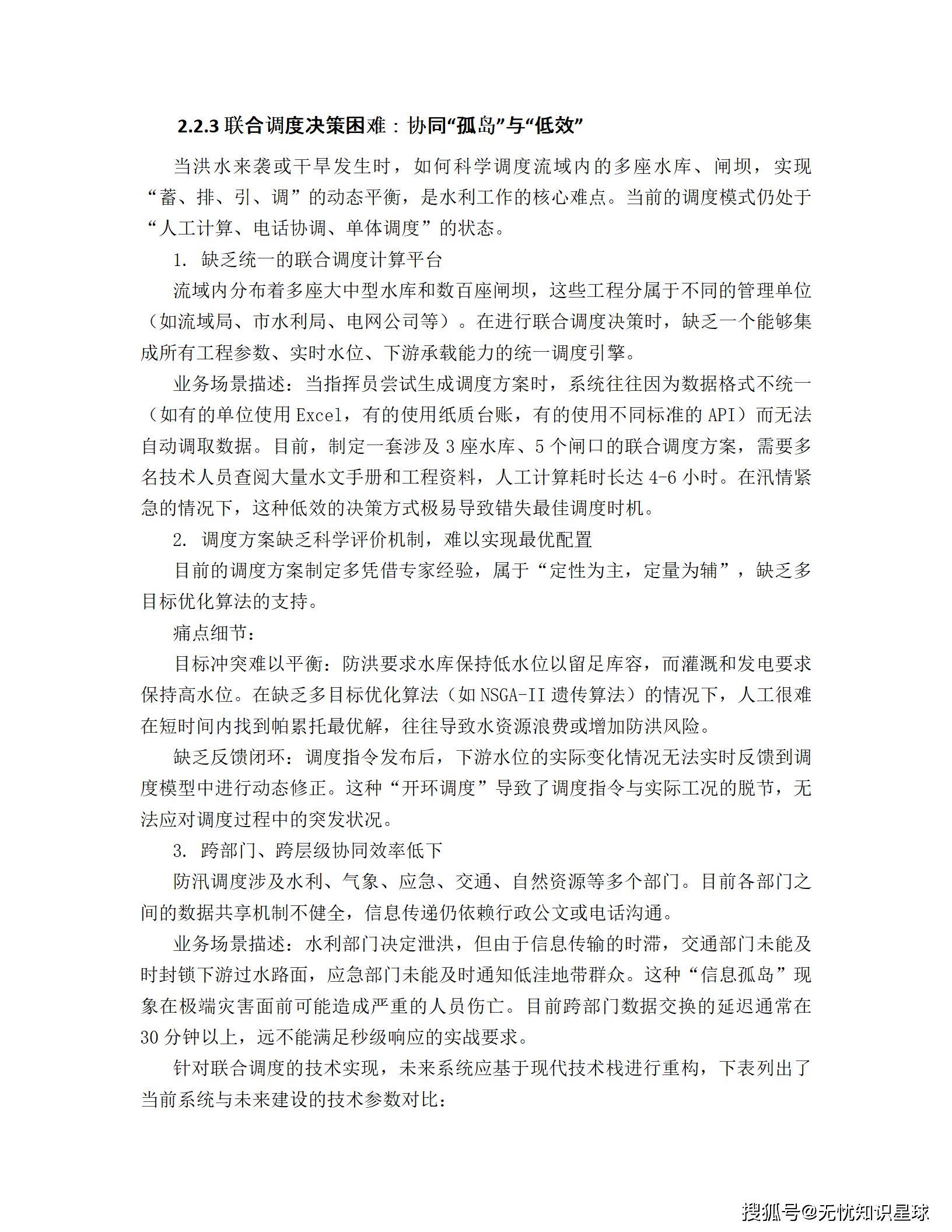 - 协同"孤岛":水库、闸坝分属不同单位,数据格式不一,联合调度需人工查阅大量资料,制定一套方案耗时4-6小时。