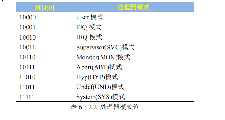 M [4:0]:处理器模式控制位,含义如下表所示:
